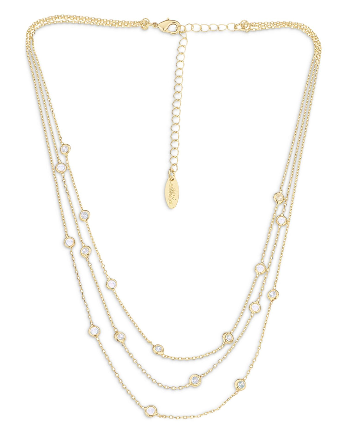 18K gold-plated metal with cubic zirconia. Chain length: 13'-15' with a 3' extension. Lobster clasp closure.