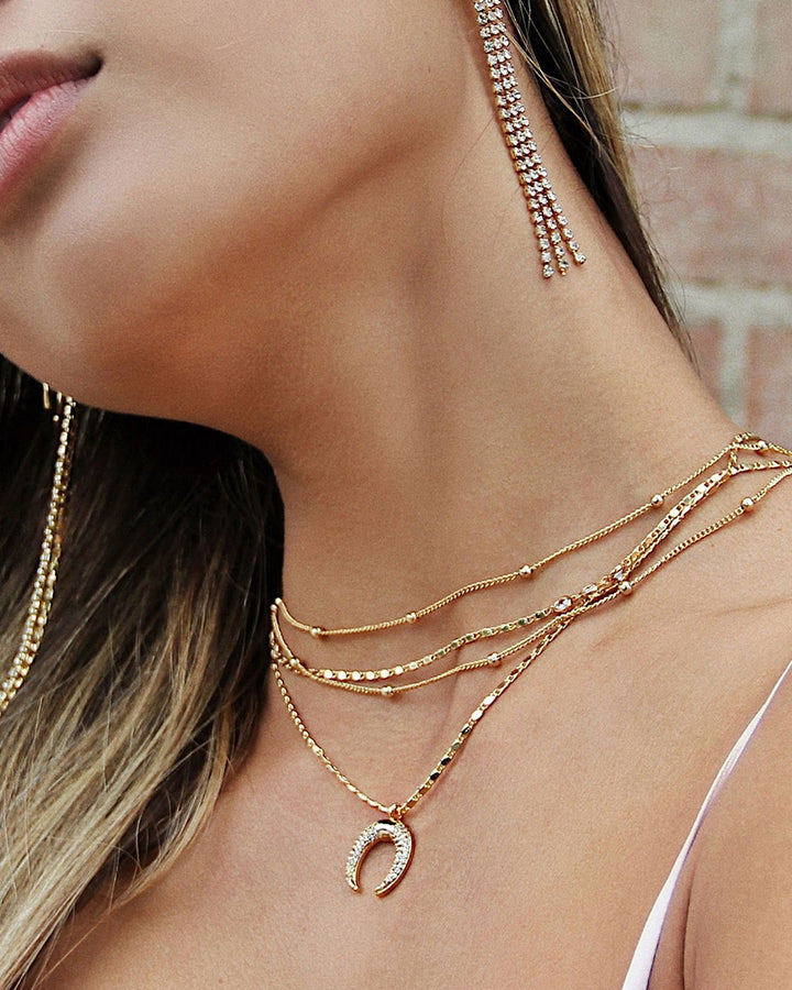 This Layered Chain & Horn Pendant Necklace by Ettika blends modern edge with timeless elegance. The 18K gold-plated design features layered chains and a cubic zirconia-accented horn pendant, perfect for elevating your everyday look.