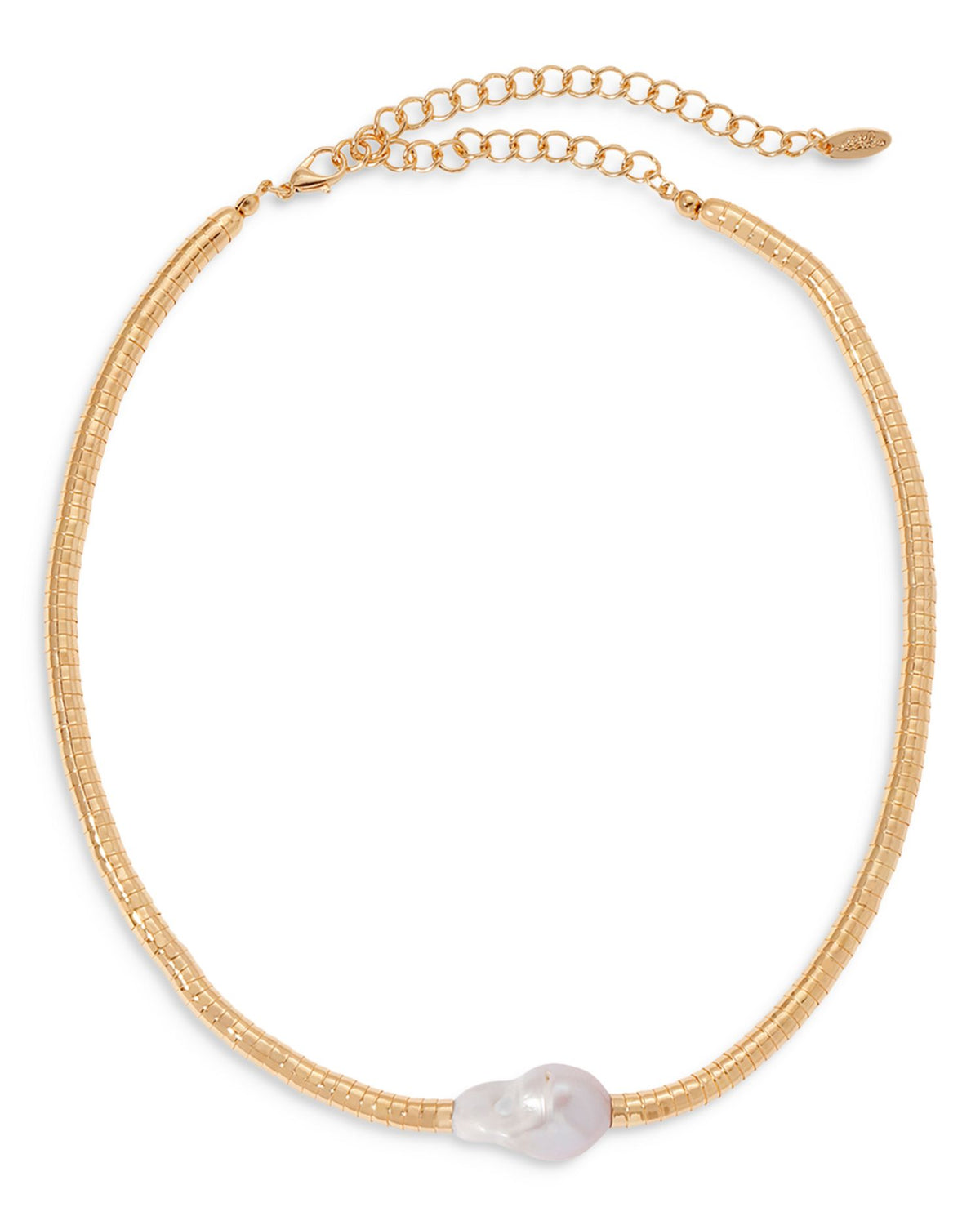 Handcrafted in 18K gold-plated brass with a freshwater baroque pearl measuring 23mm. Adjustable length of 15-20" and secured with a lobster clasp closure.