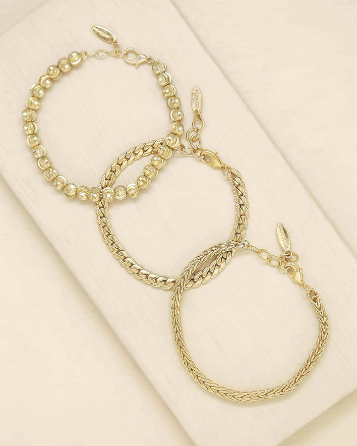 This Classical Bracelets Set by Ettika combines timeless design with contemporary style in a set of three elegant gold-plated bracelets. Perfect for stacking or wearing individually, they offer endless versatility.