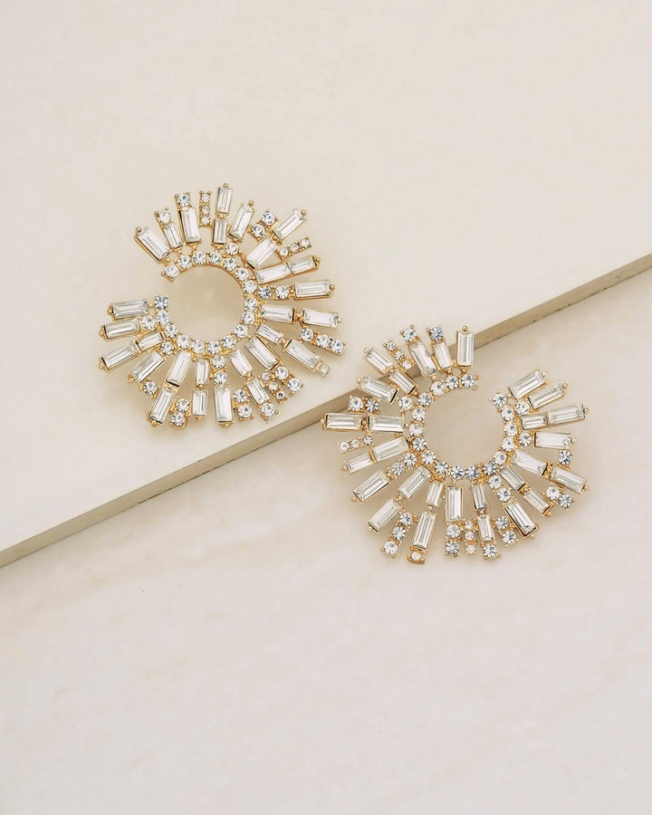 Made from 18K gold-plated zinc with glass embellishments. Measure 1.95' in length and secured with post-back closures.