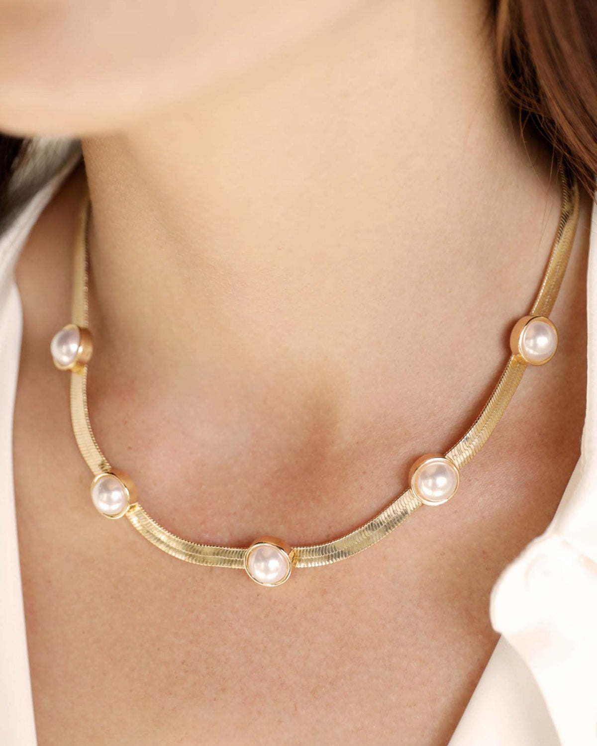 Imitation Pearl Dotted Snake Chain Necklace in 18K Gold Plated, 16'
