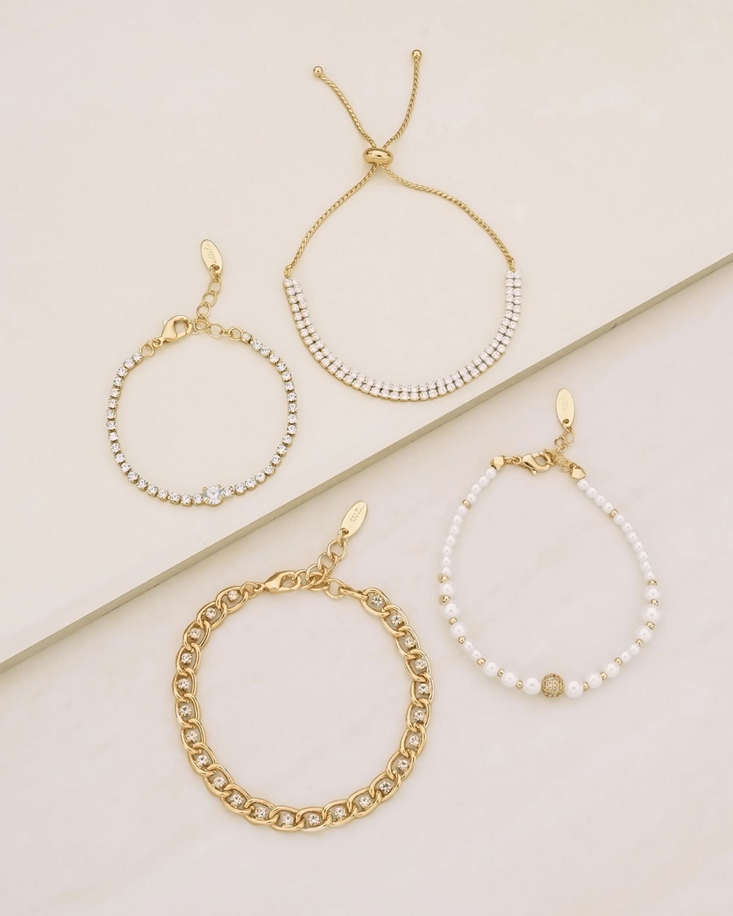 Crafted in 18K gold-plated brass, steel, glass, and acrylic imitation pearls. Three chain bracelets measure 5.5' in length with a 1' extender, and one sliding bracelet is adjustable up to 10'. Features lobster clasp and sliding toggle closures.