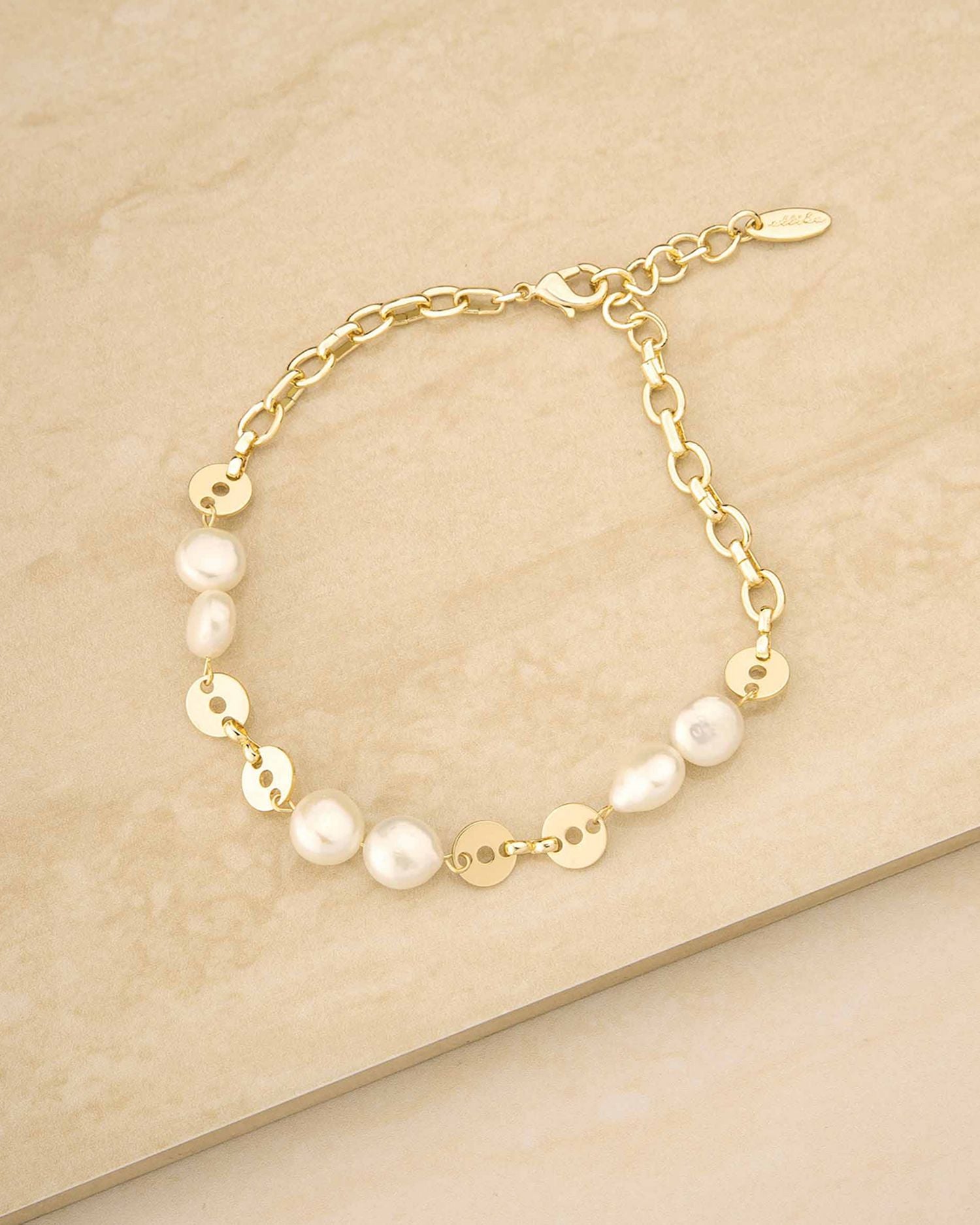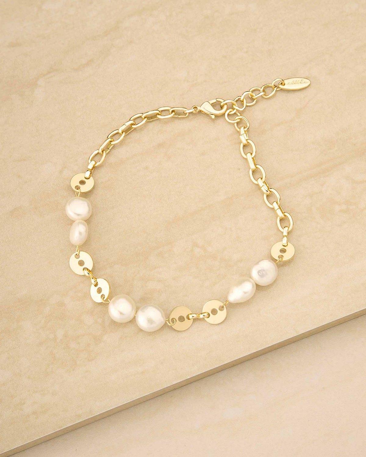 Crafted in 18K gold-plated brass and steel with 8mm cultured freshwater pearls. Measures 9' in length with a 1' extender and a lobster clasp closure.