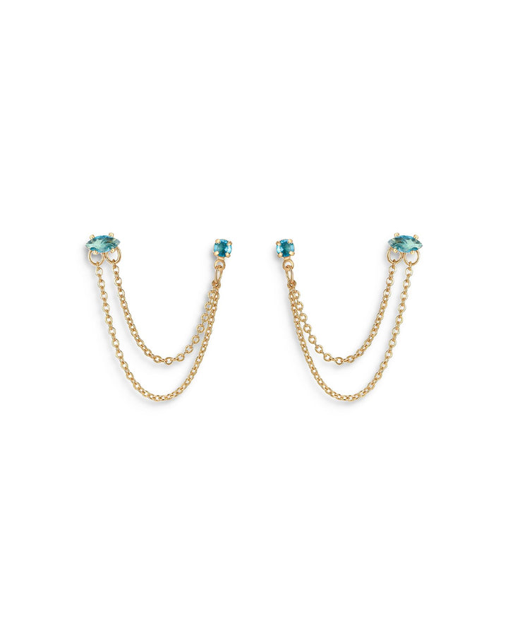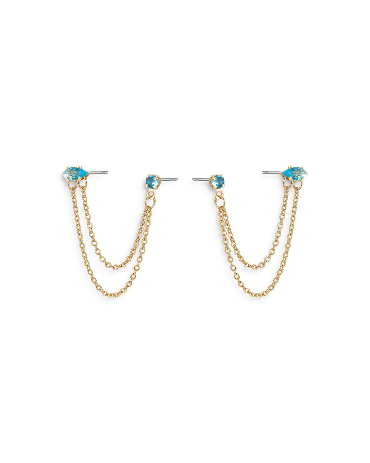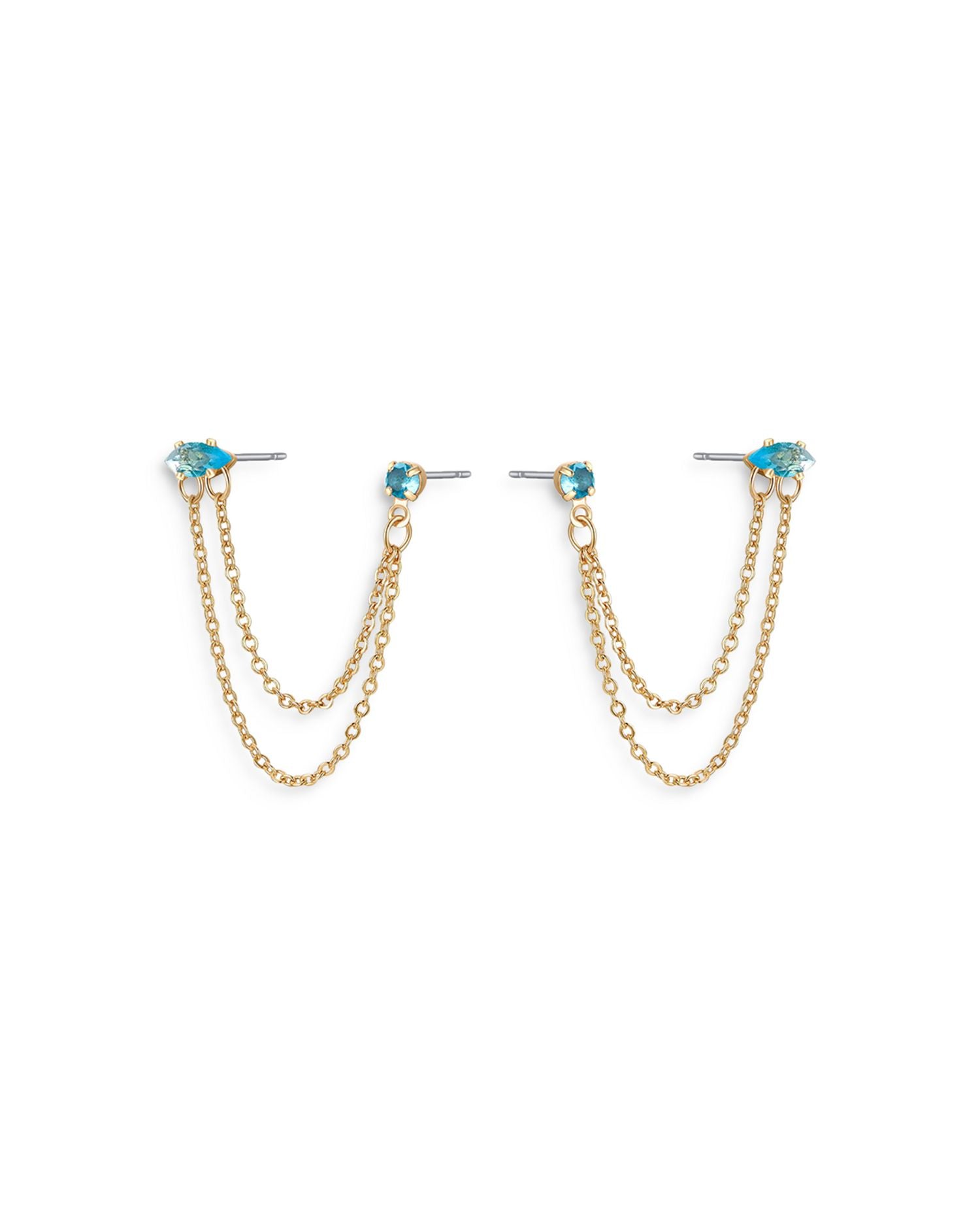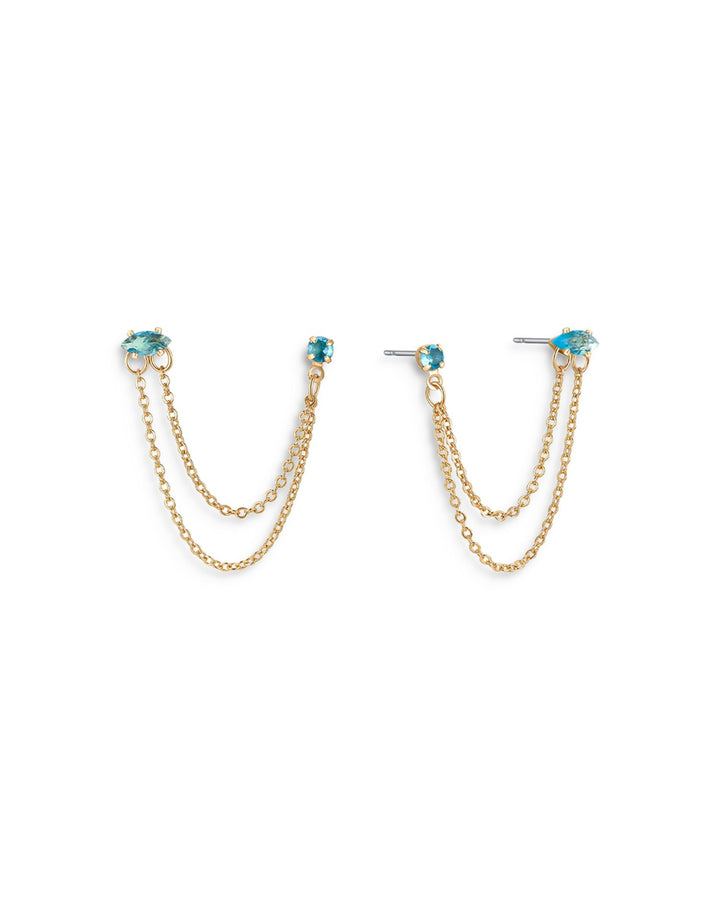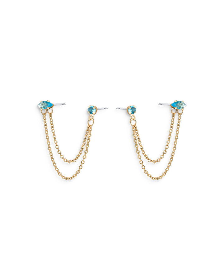 Blue Crystal & Looped Chains Double Piercing Drop Earrings in 18K Gold Plated