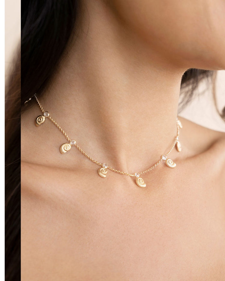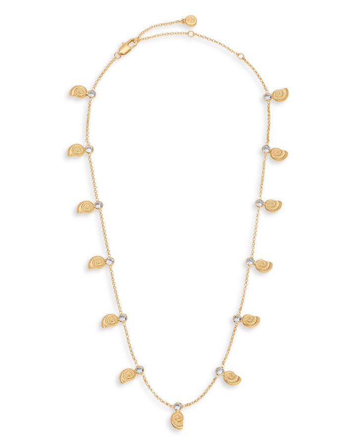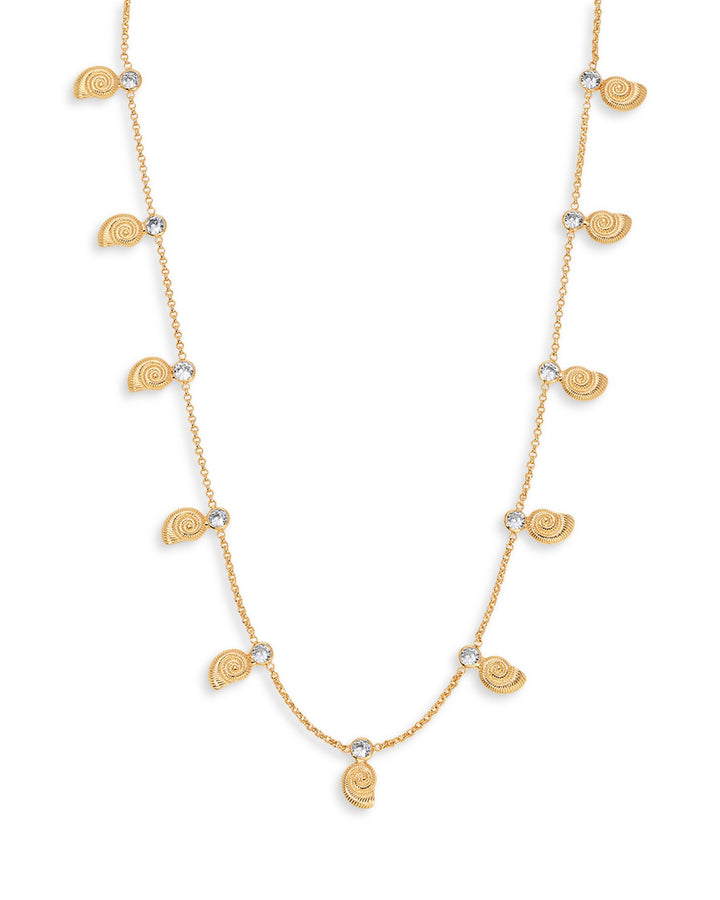 This Swirled Shell Dangle Charm Necklace by Ettika combines playful charm with refined elegance. Featuring swirled shell pendants adorned with sparkling crystals, it’s perfect for layering or wearing as a standout piece.