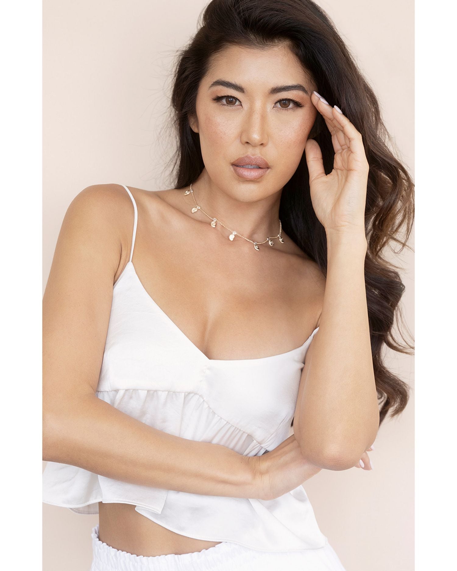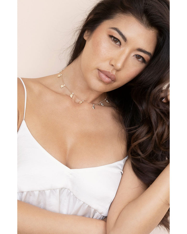 Made from 18K gold-plated zinc with glass crystals. Adjustable length of 15" with a 4" extension. Secured with a lobster clasp closure.