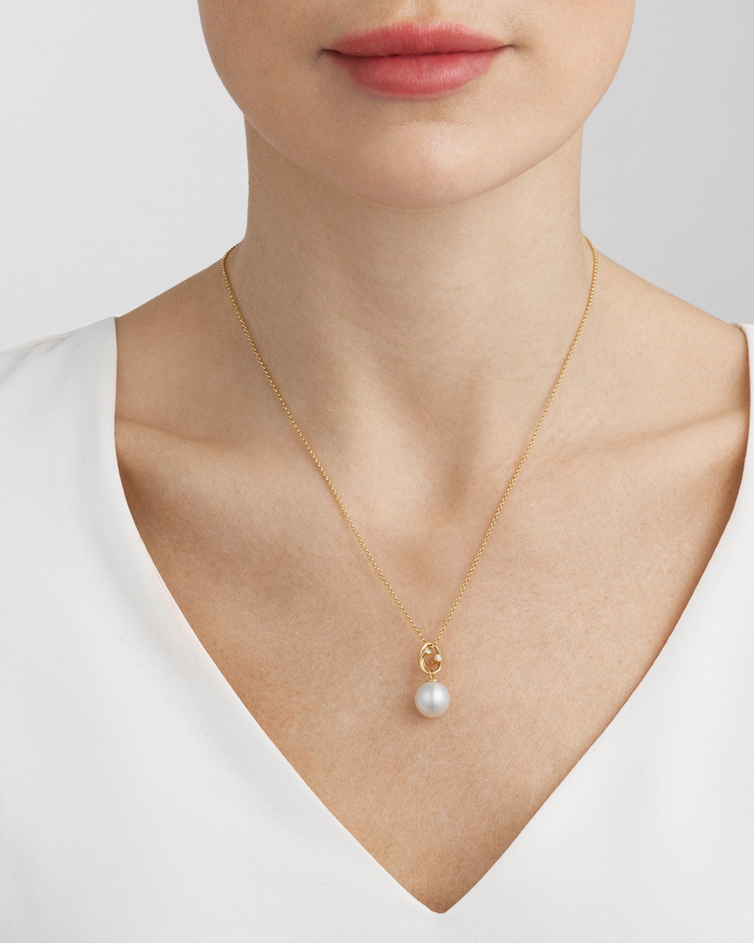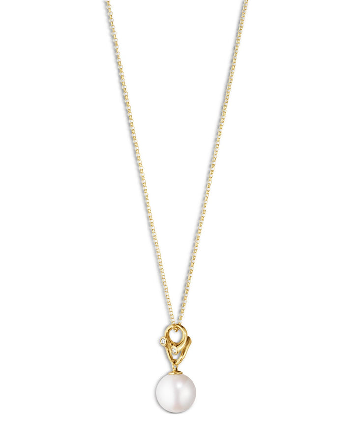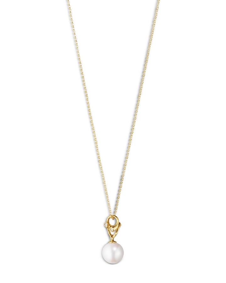 Made from 18K yellow gold with a white freshwater cultured pearl and 0.04 ct. t.w. diamonds (G-VS). Measures 17.72' in length with a 0.39' pendant. Secured with a lobster clasp closure.