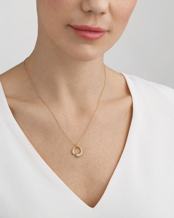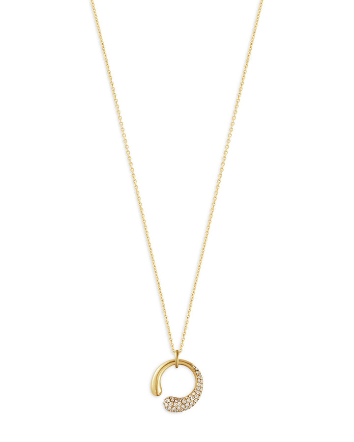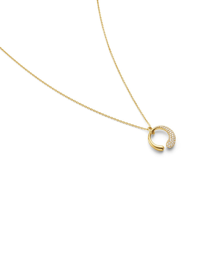 This 18K Yellow Gold Diamond Pavé Mercy Small Pendant Necklace by Georg Jensen, from the Mercy Collection, features a dazzling diamond pavé sculptural pendant on a delicate link chain. Its elegant design makes it a timeless accessory for any occasion.