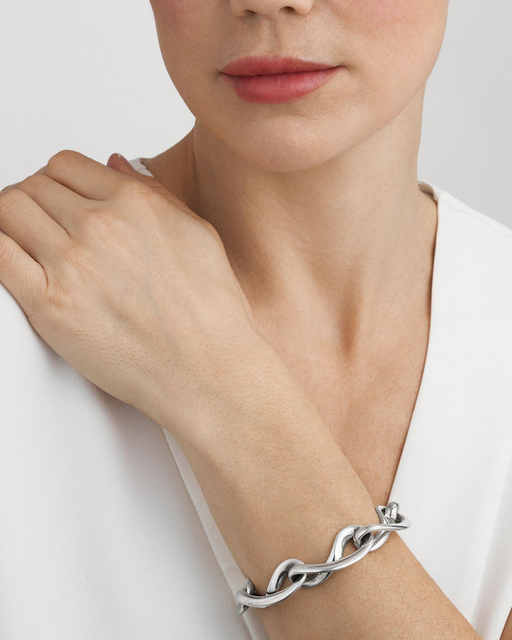 This Sterling Silver Infinity Link Chain Bracelet by Georg Jensen, part of the Infinity collection, showcases curved infinity-inspired links, symbolizing endless connections. Its bold design adds a statement finish to your wrist.