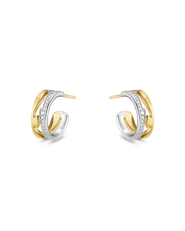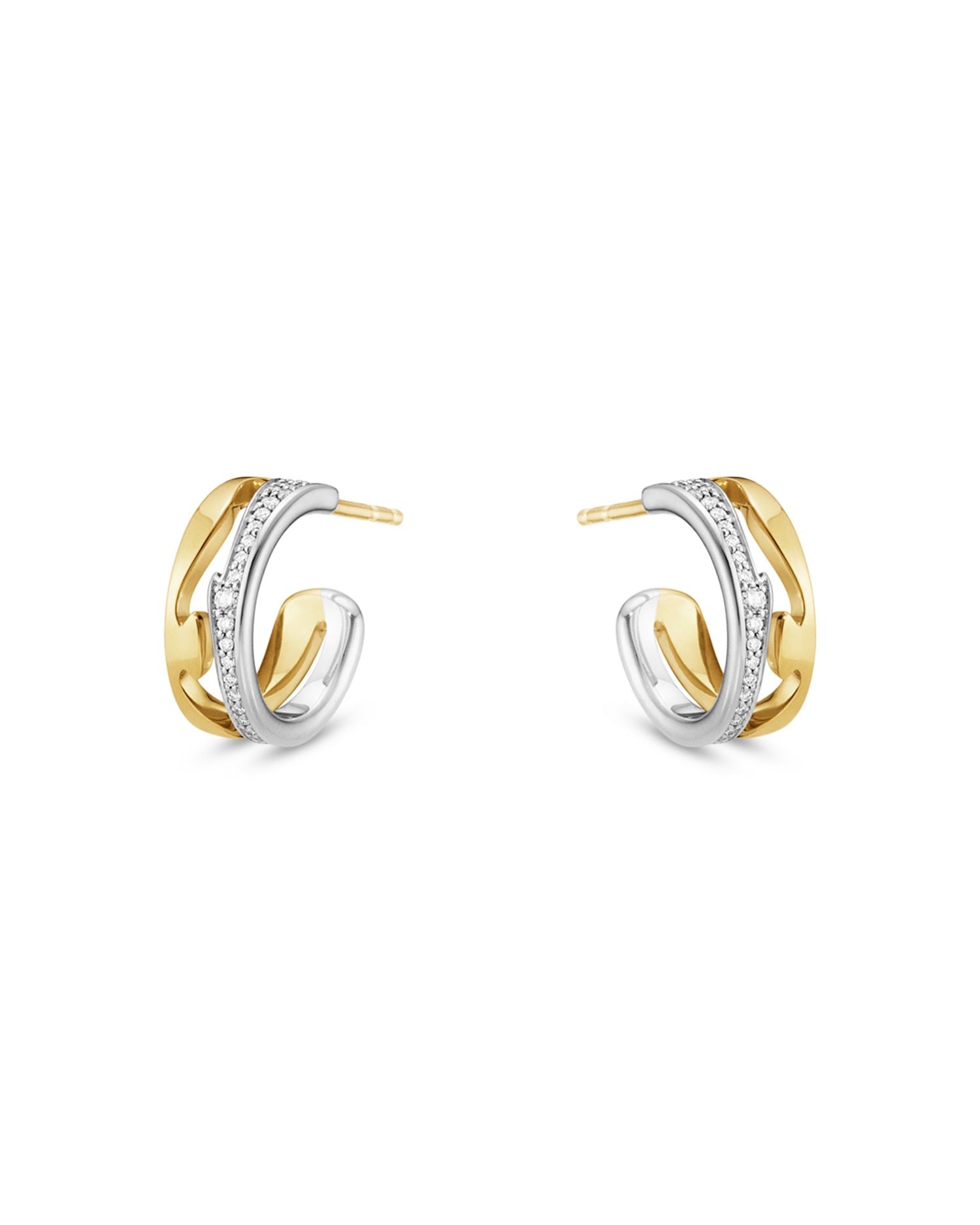 These Fusion Diamond Small Hoop Earrings by Georg Jensen, part of the Fusion collection, let you express your individuality with their dynamic design. Available in 18K white, yellow, and rose gold, these hoops are adorned with sparkling diamonds, adding a luxurious touch to your look.