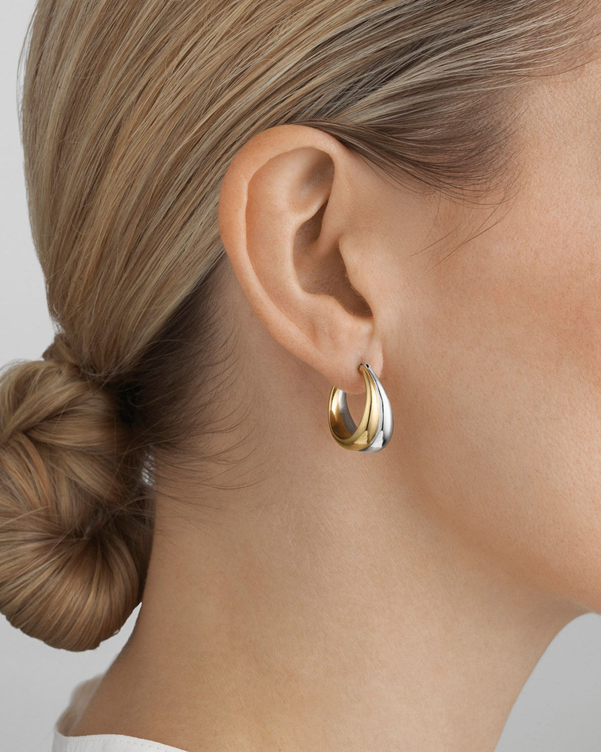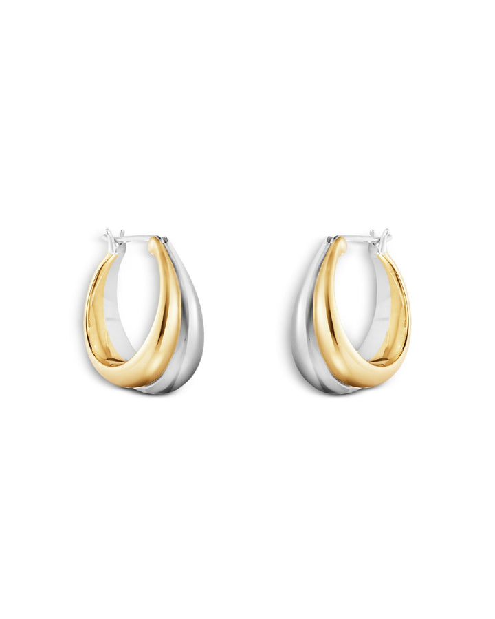 These 18K Yellow Gold & Sterling Silver Curve Graduated Hoop Earrings by Georg Jensen from the Curve collection feature a timeless two-tone design. Their curvy, graduated silhouette makes them versatile and elegant for any occasion.