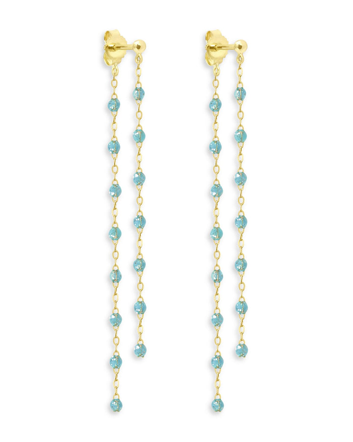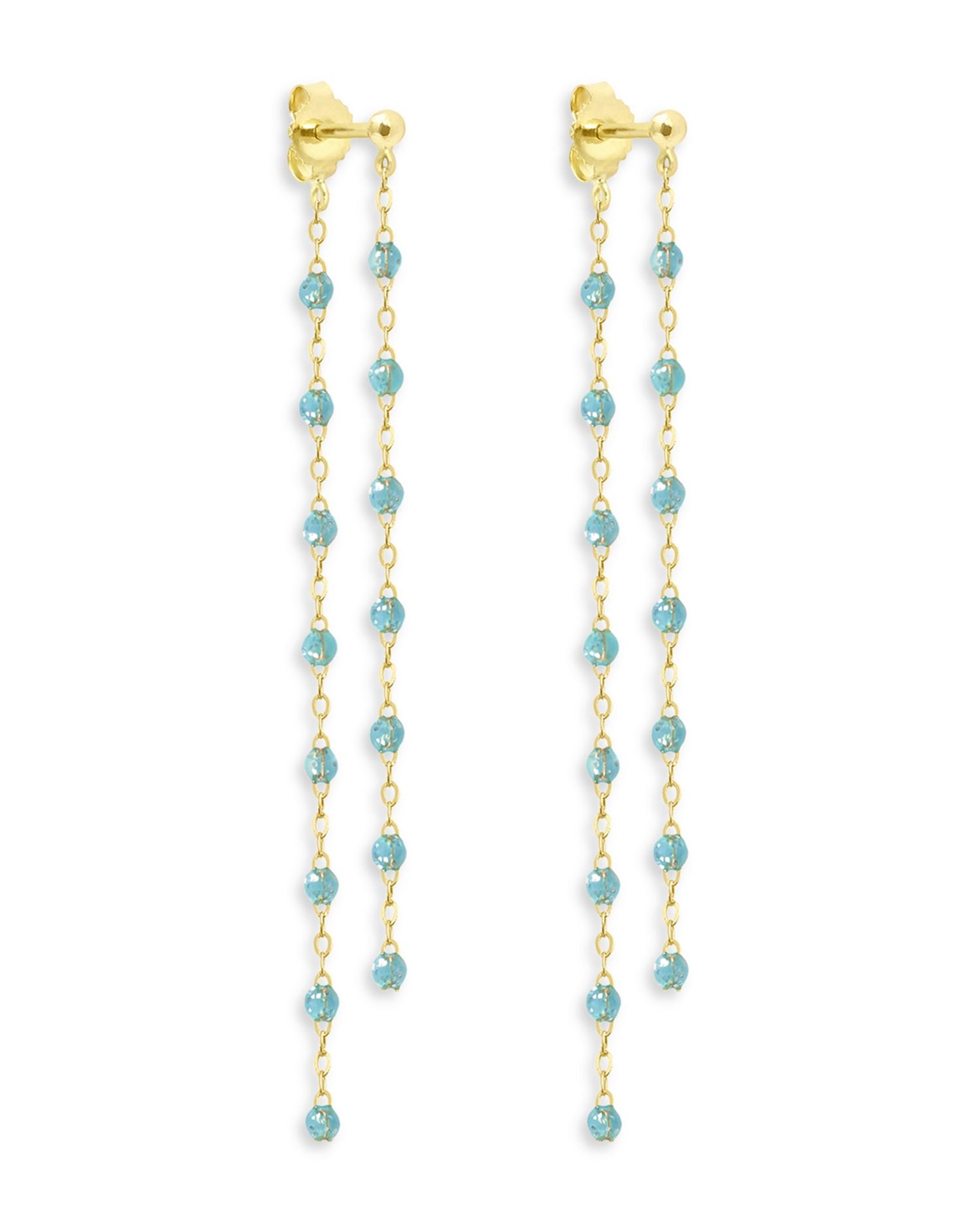 These 18K Yellow Gold Classic Gigi Dancing Earrings by Gigi Clozeau, from the Classic Gigi collection, feature dangling chains adorned with colorful resin beads. Their dynamic design adds movement and vibrancy to your look.