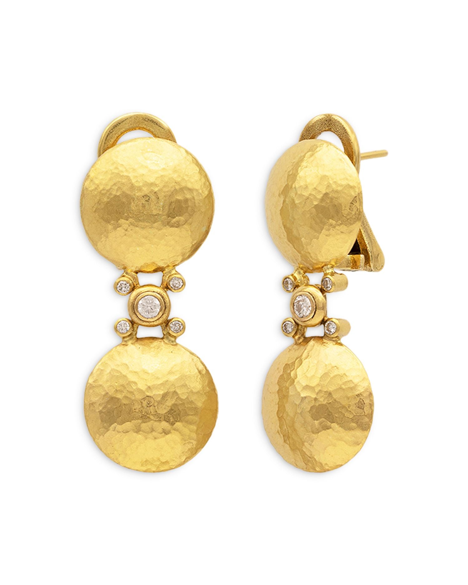 Handcrafted in 24K yellow gold with 14K & 18K yellow gold clips and posts. Includes 0.25 ct. t.w. diamonds. Measures 1.4' in length. Features omega back closures. Made in Turkey. All gemstone carat weights are approximate; variance may be 0.05 carat.