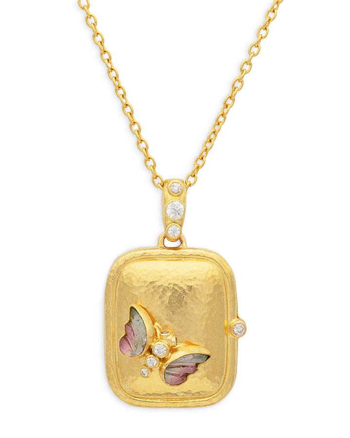 This 18 & 24K Yellow Gold Locket Watermelon Tourmaline & Diamond Butterfly Locket Pendant Necklace by Gurhan, from the Locket collection, features a stunning rectangular locket adorned with a butterfly motif of watermelon tourmaline and diamonds. Champagne diamond accents add a touch of luxury to this unique piece.