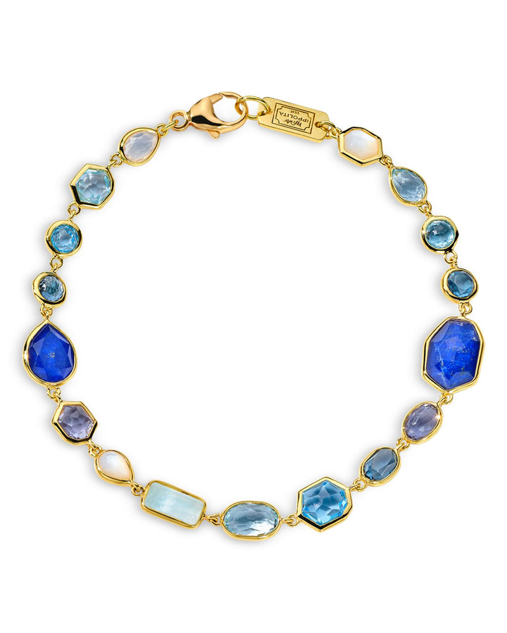Crafted in 18K yellow gold with light iolite, lapis doublet, London blue topaz, blue topaz, mother-of-pearl doublet, rock crystal over larimar doublet, and Swiss blue topaz. Measures 7.5' in length with a lobster clasp closure.