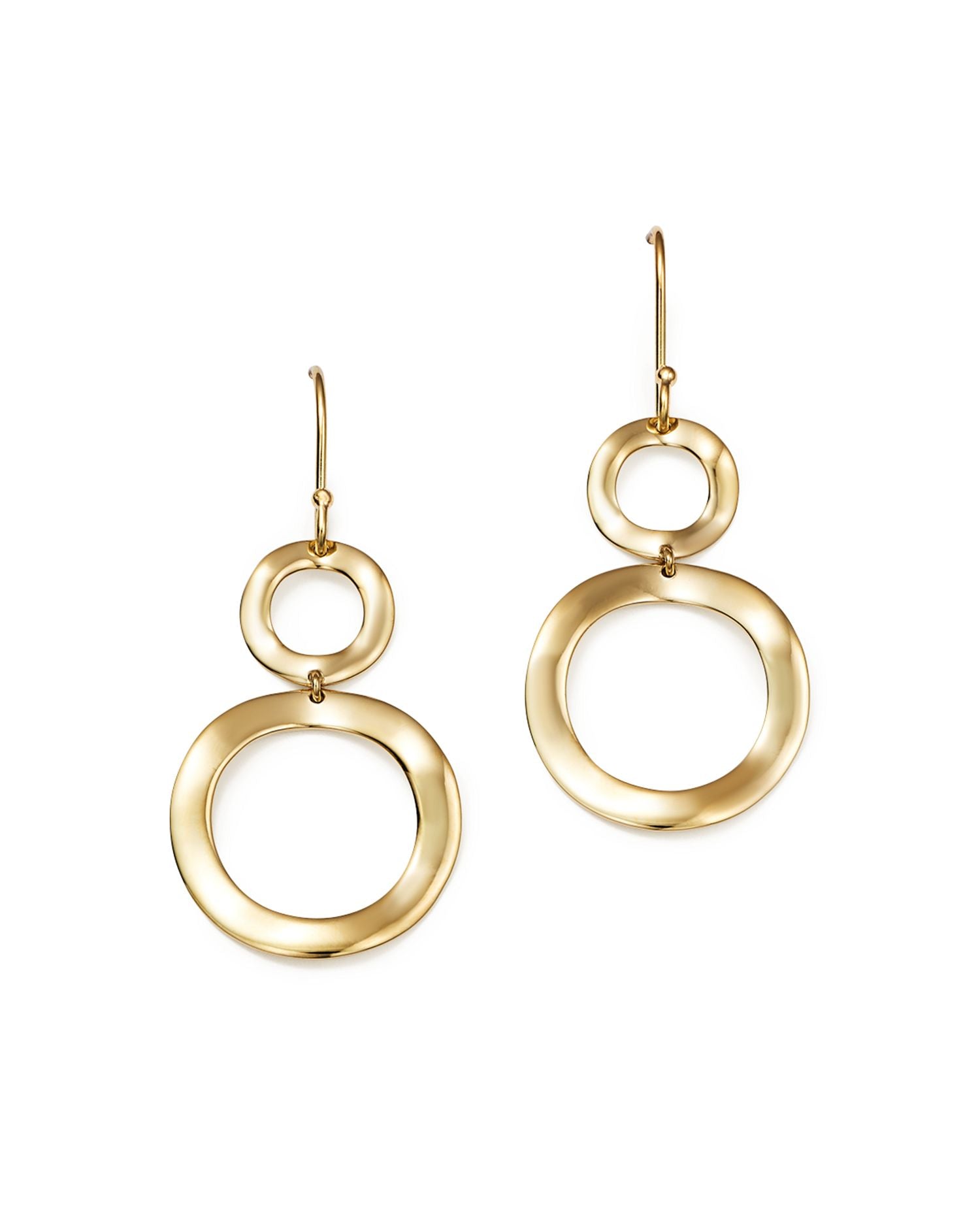 These 18K Gold Snowman Earrings by IPPOLITA feature wavy gold circles that shimmer and shine, creating a striking and sophisticated look. Their design adds a playful yet elegant touch to any outfit.