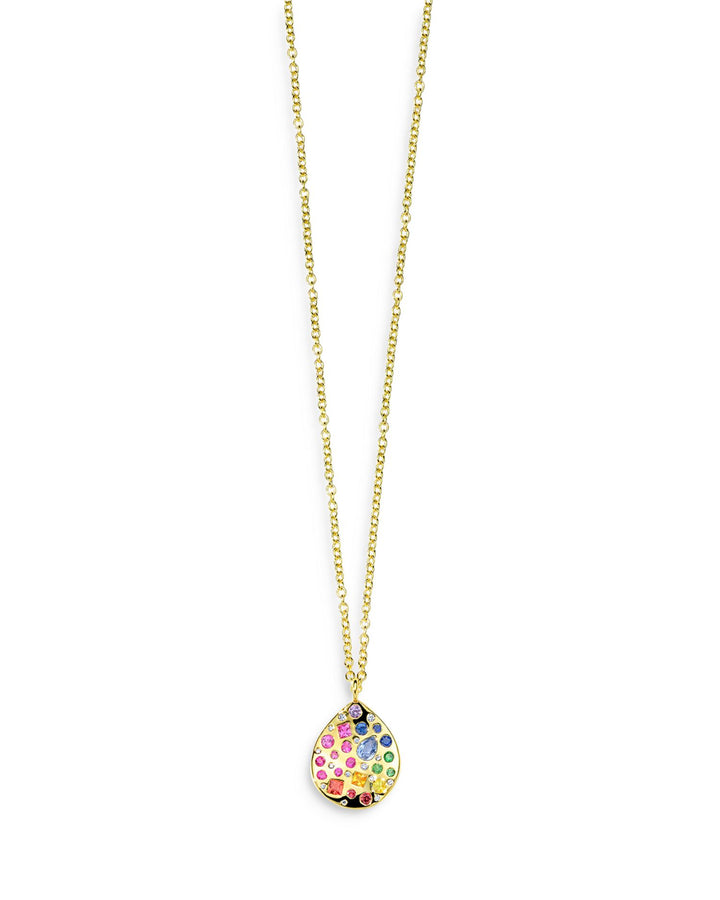 This 18K Yellow Gold Rock Candy Gemstone & Diamond Wavy Teardrop Pendant Necklace by IPPOLITA, from the 18K Rock Candy® collection, features a stunning teardrop pendant adorned with rainbow sapphires, tsavorite, and diamonds. This exclusive piece is an exquisite addition to any jewelry collection.