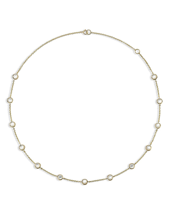 This 18K Yellow Gold Lollipop® Mother of Pearl Station Collar Necklace by Ippolita exudes timeless elegance. From the Lollipop® collection, the necklace features iridescent mother-of-pearl stones that cast a glossy sheen. Its adjustable chain and radiant design make it a must-have piece for both everyday sophistication and special occasions.