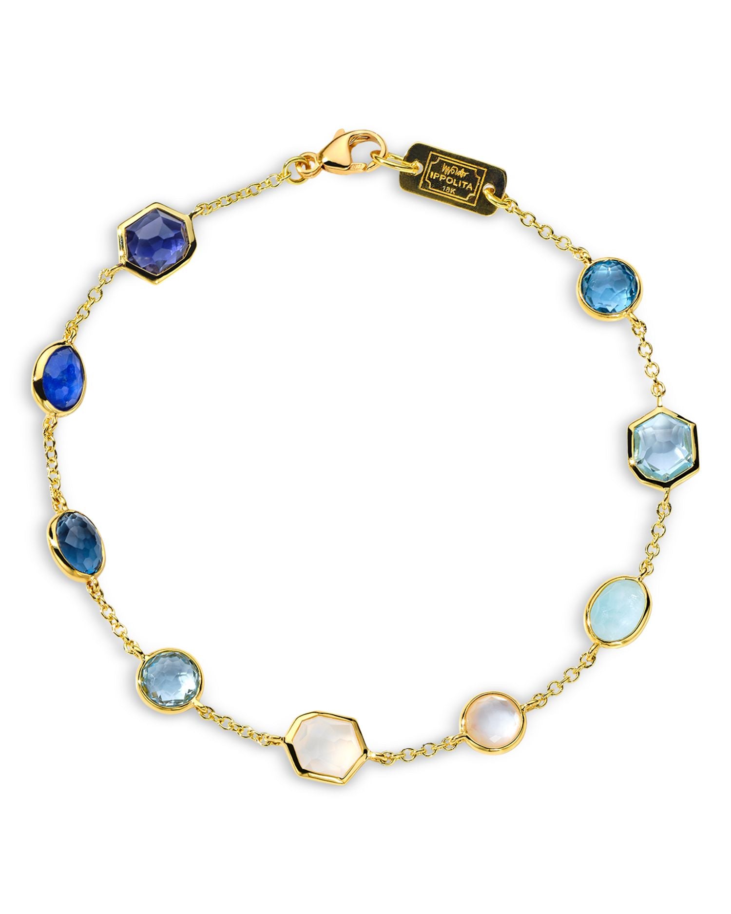 Handcrafted in 18K yellow gold with light iolite, lapis doublet, London blue topaz, blue topaz, mother-of-pearl doublet, rock crystal over larimar doublet, and Swiss blue topaz. Measures 7.5' in length with a lobster clasp closure. Variance of 0.05 carats.