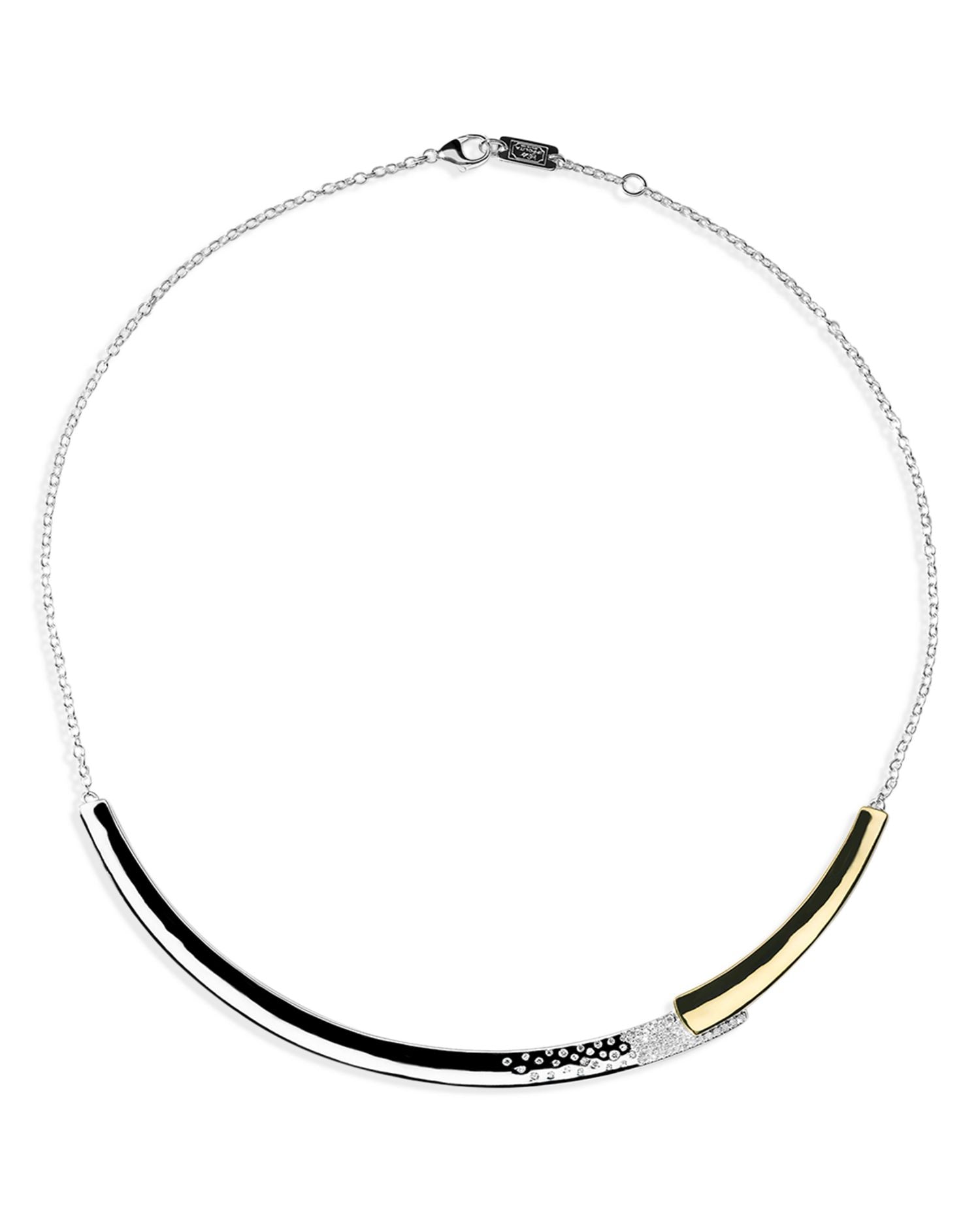 This 18K Yellow Gold & Sterling Silver Stardust Diamond Pavé Overlap Bar Necklace by Ippolita features an elegant two-tone design highlighted with sparkling pavé diamonds. From the Stardust collection, the overlap bar design adds a modern, sophisticated accent to any outfit, perfect for special occasions or everyday luxury.