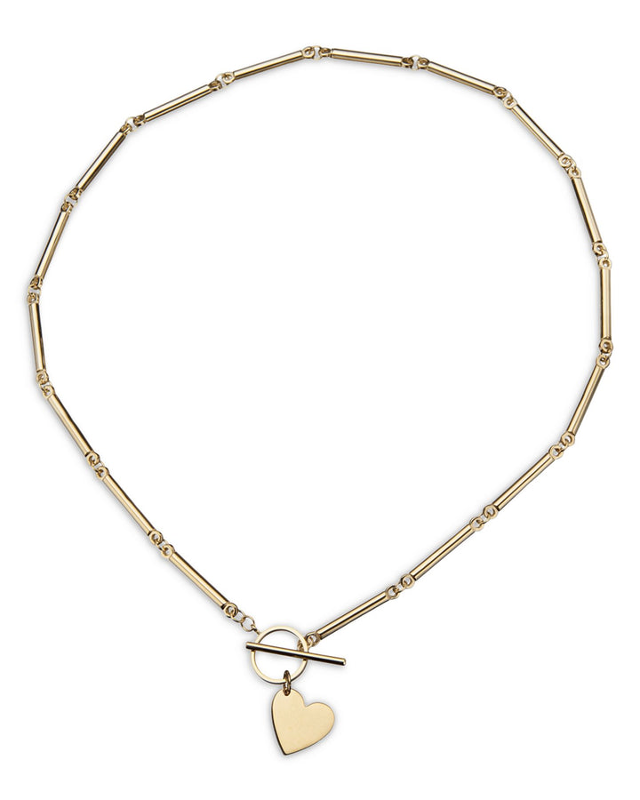 This Melody Heart Pendant Bar Necklace in 18K Gold Plated Sterling Silver by Jennifer Zeuner offers a delicate and charming design. From the Melody collection, its heart-shaped pendant and toggle closure add a playful yet refined touch, making it an ideal everyday accessory.