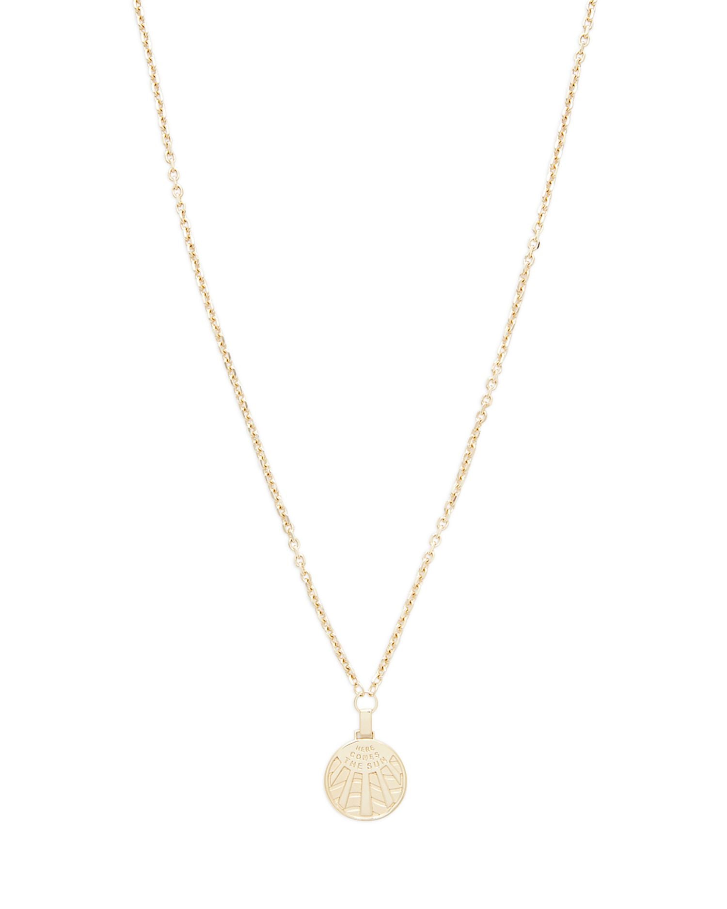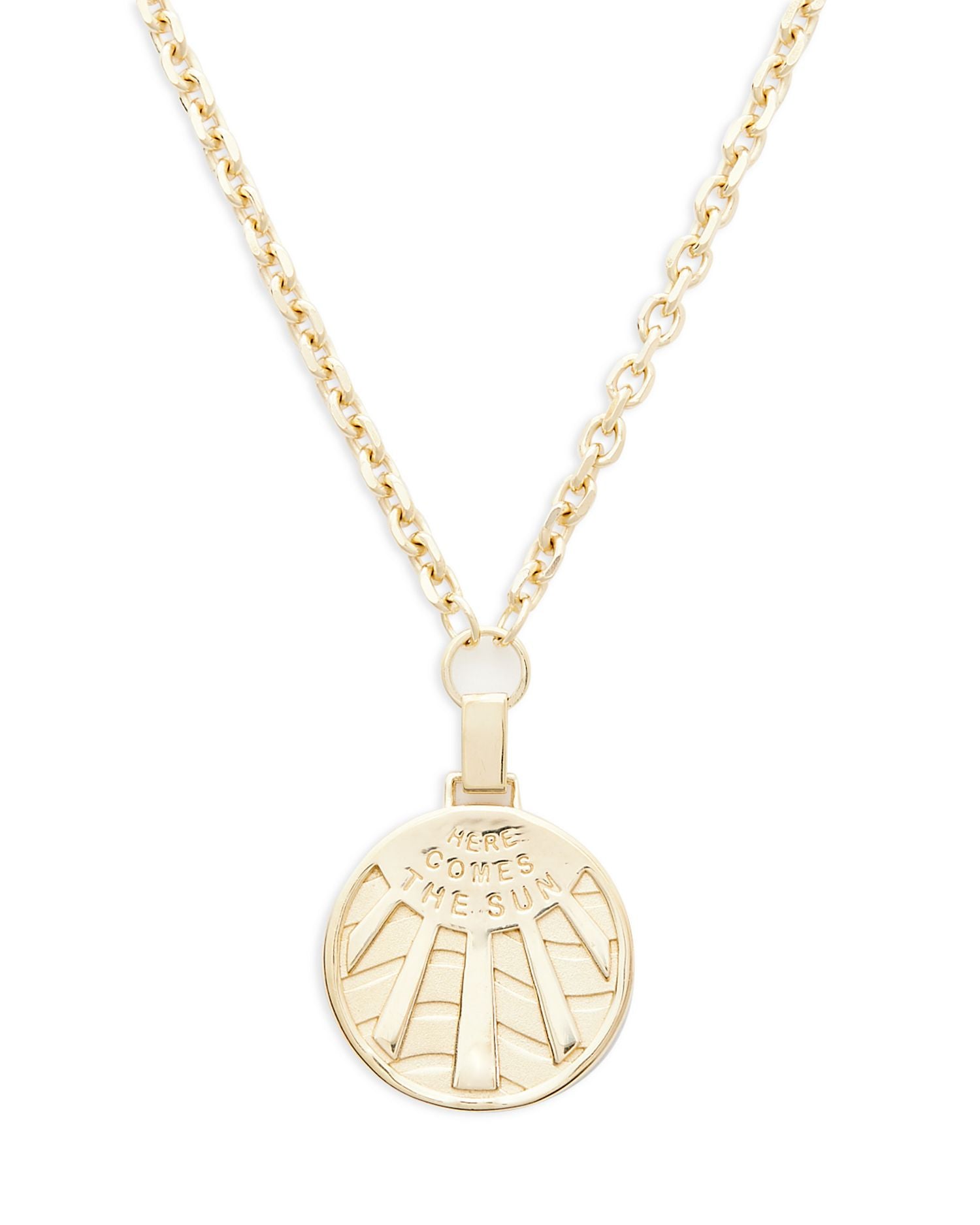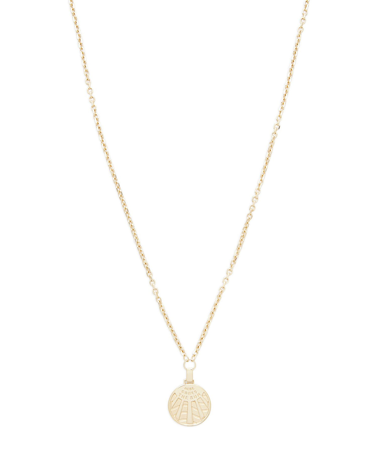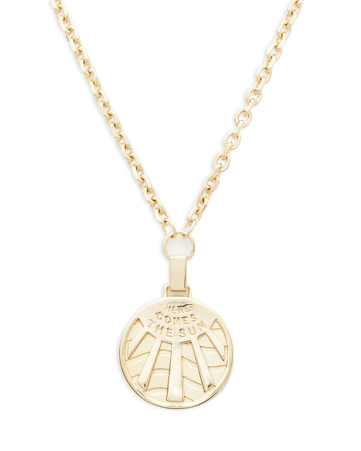 This Marisol Sun Ray 'Here Comes the Sun' Disc Pendant Necklace by Jennifer Zeuner radiates positivity and warmth. Its sun ray-inspired pendant engraved with 'Here Comes the Sun' adds a playful yet meaningful touch, making it a perfect everyday accessory.