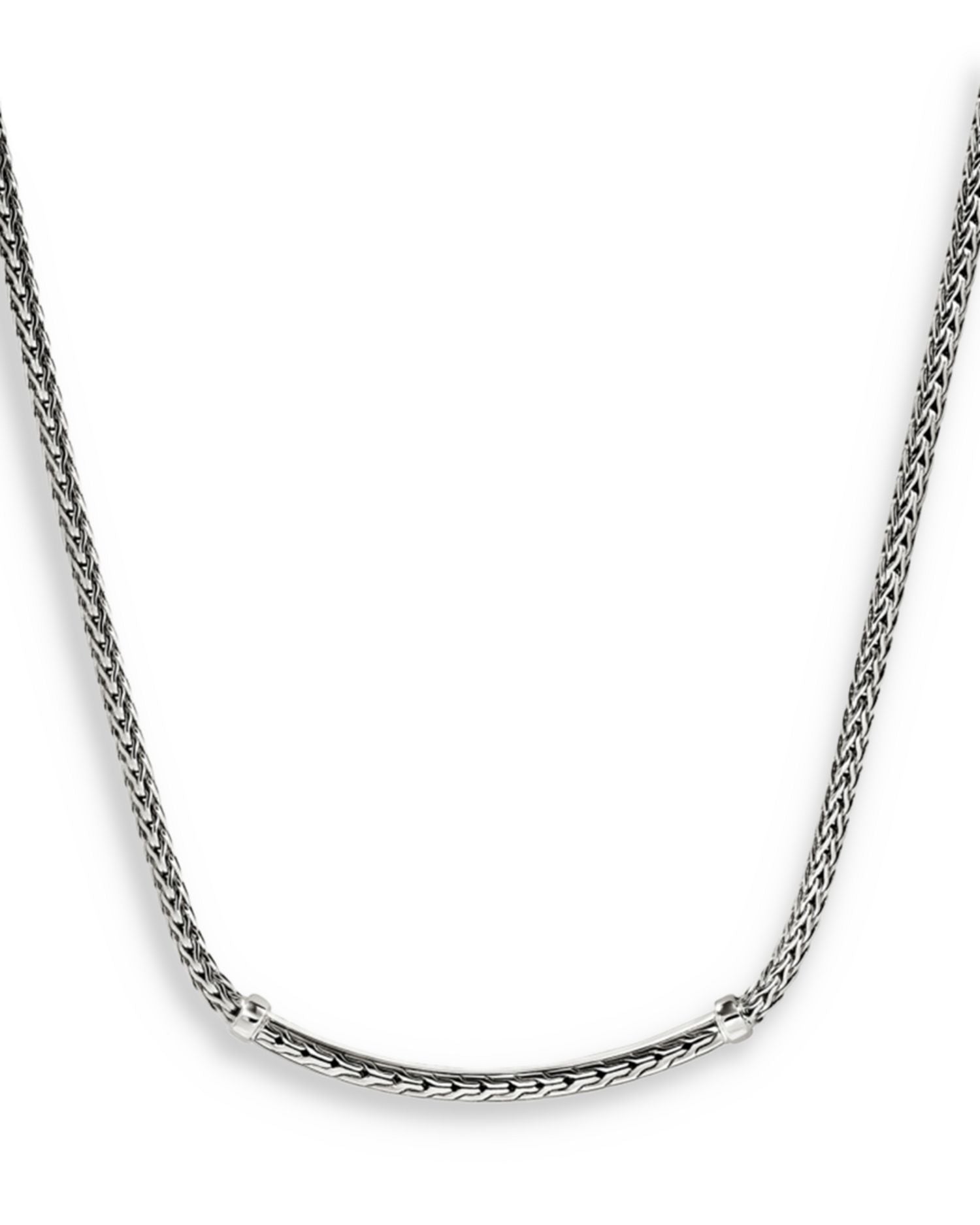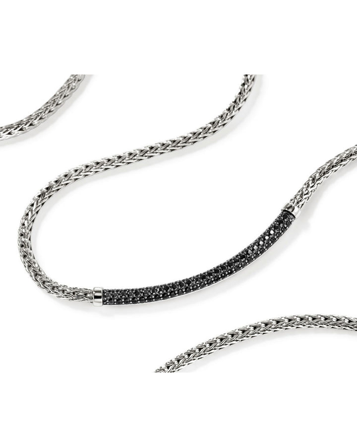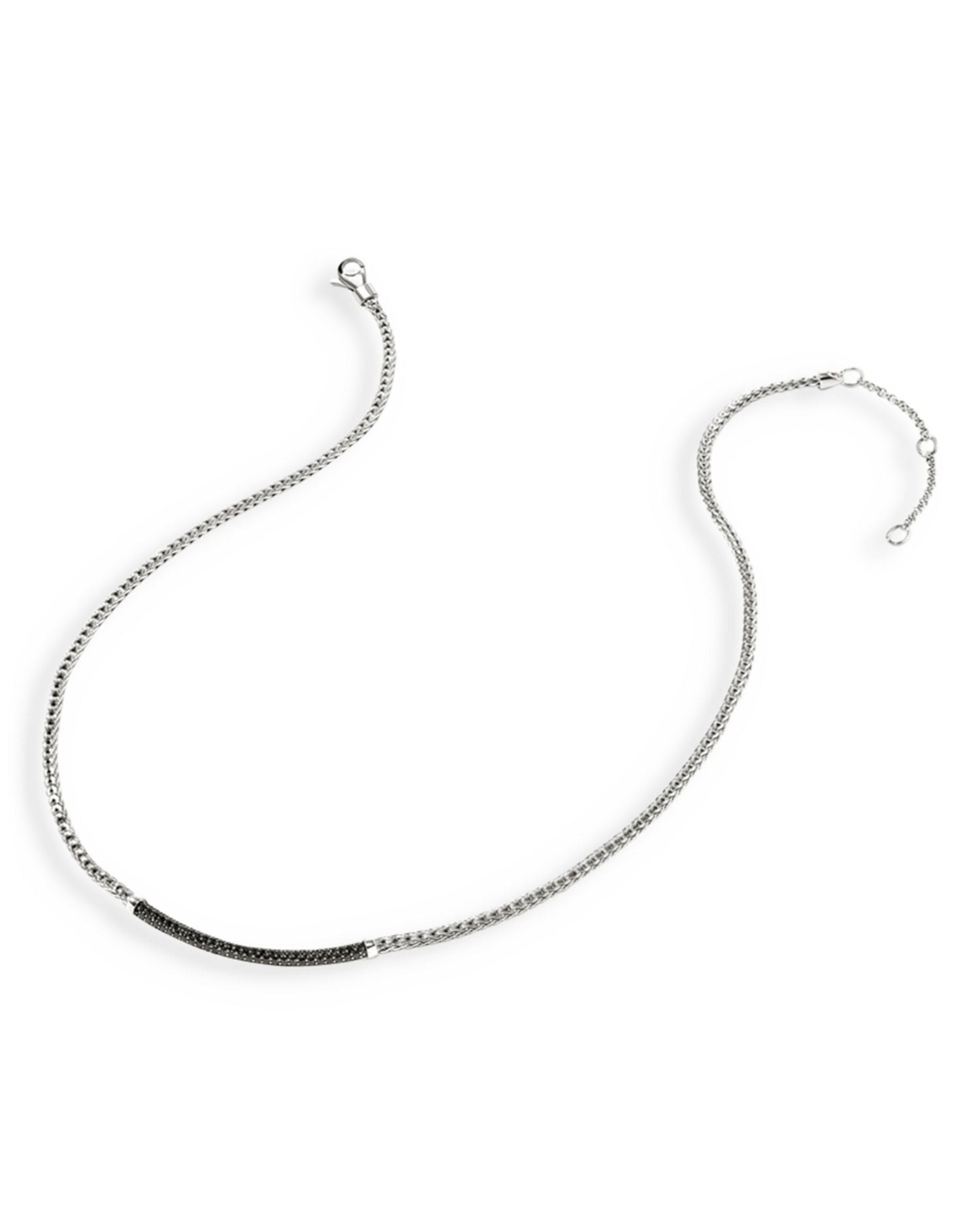 This Sterling Silver JH Essentials Black Sapphire Pavé Curved Bar Necklace by John Hardy brings a bold and glamorous edge to a classic design. From the JH Essentials collection, its black sapphire pavé accents and adjustable length make it a sophisticated accessory for day or evening wear.