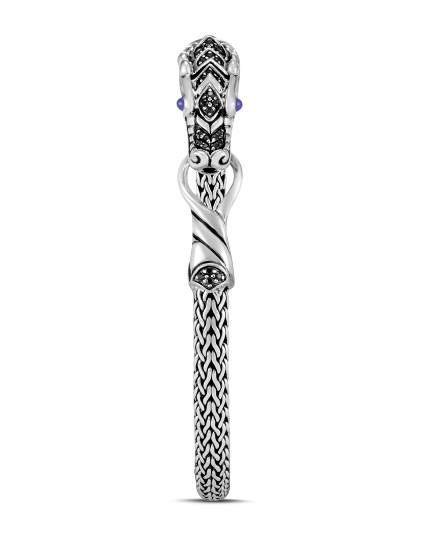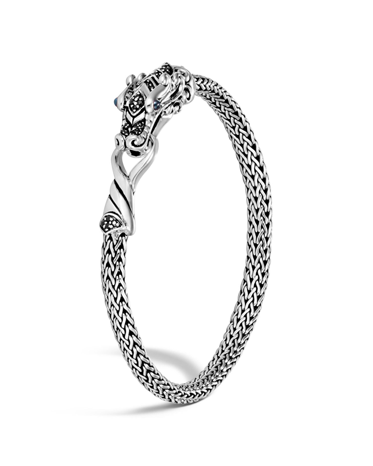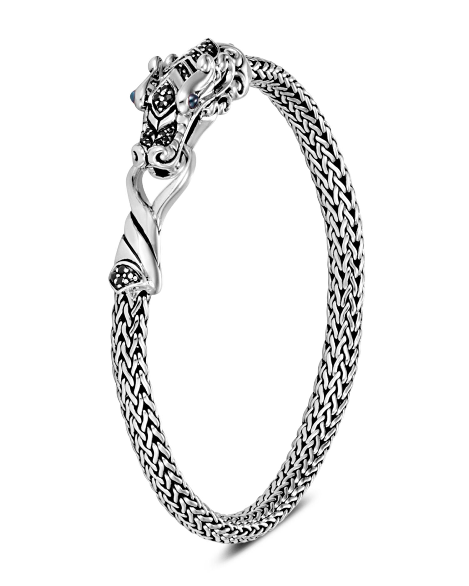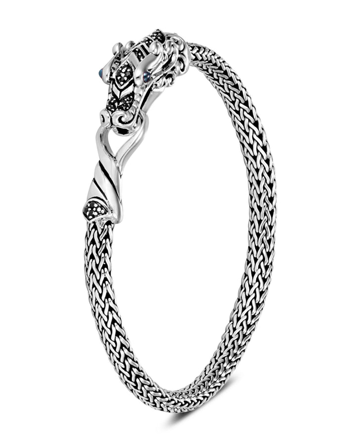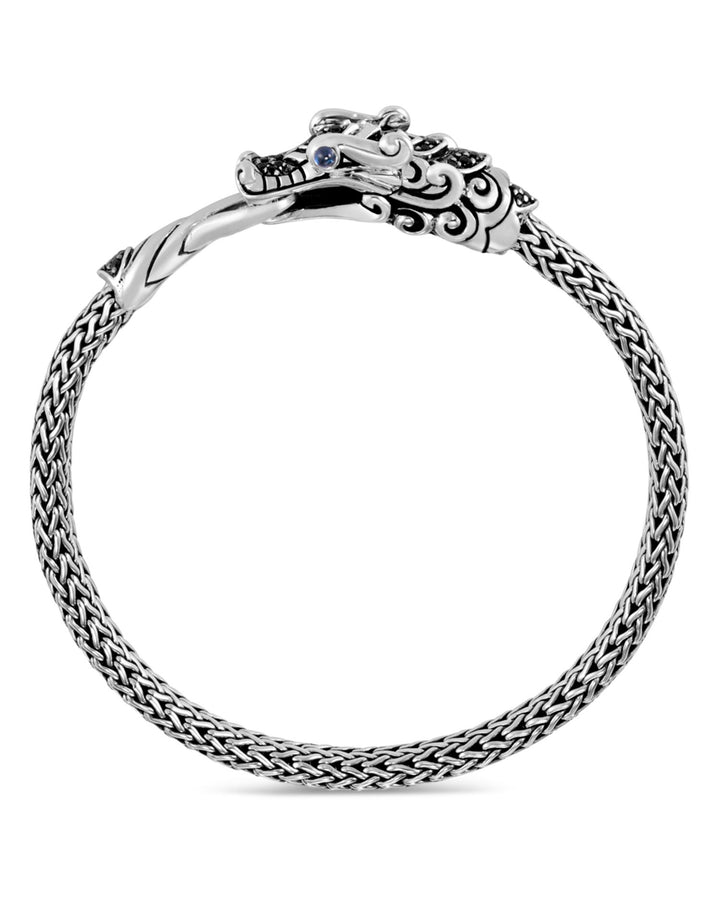 This Sterling Silver Legends Naga Extra Small Chain Bracelet with Blue Sapphire Eyes by John Hardy features the brand's iconic dragon motif, symbolizing love, protection, and prosperity. Its intricately designed chain and sapphire accents make it a meaningful and striking addition to any jewelry collection.