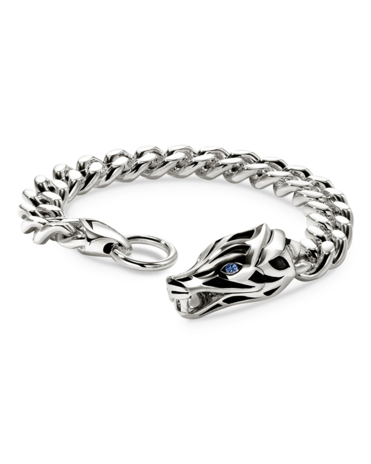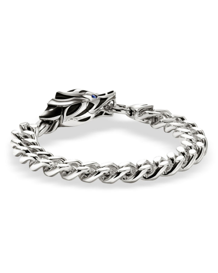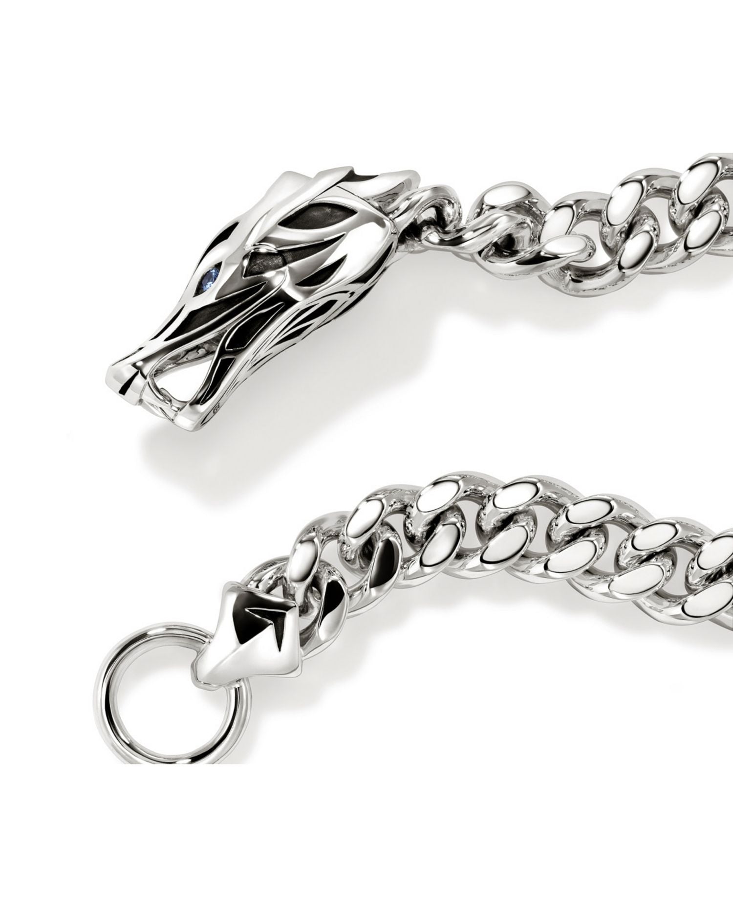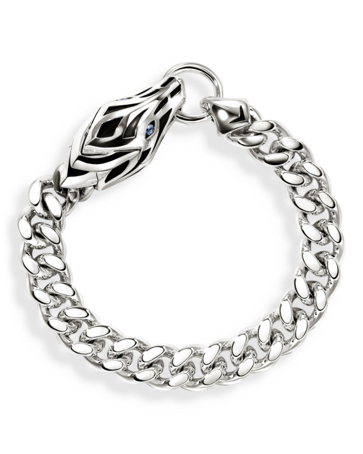 This Sterling Silver Naga Blue Sapphire Snake Curb Link Bracelet by John Hardy is a bold and iconic design from the Naga Collection, featuring bright blue sapphire eyes on a sculpted snake head. A statement piece that embodies strength and mystery.