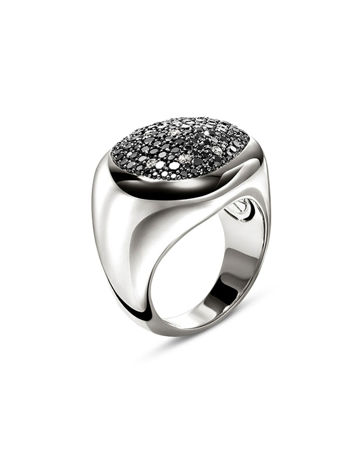 This Sterling Silver Pebble Diamond Pavé Black Sand Statement Ring by John Hardy combines exotic charm with dazzling elegance. From the Pebble collection, its black sand-inspired motif and pavé black and white diamonds make it a bold and captivating statement piece.