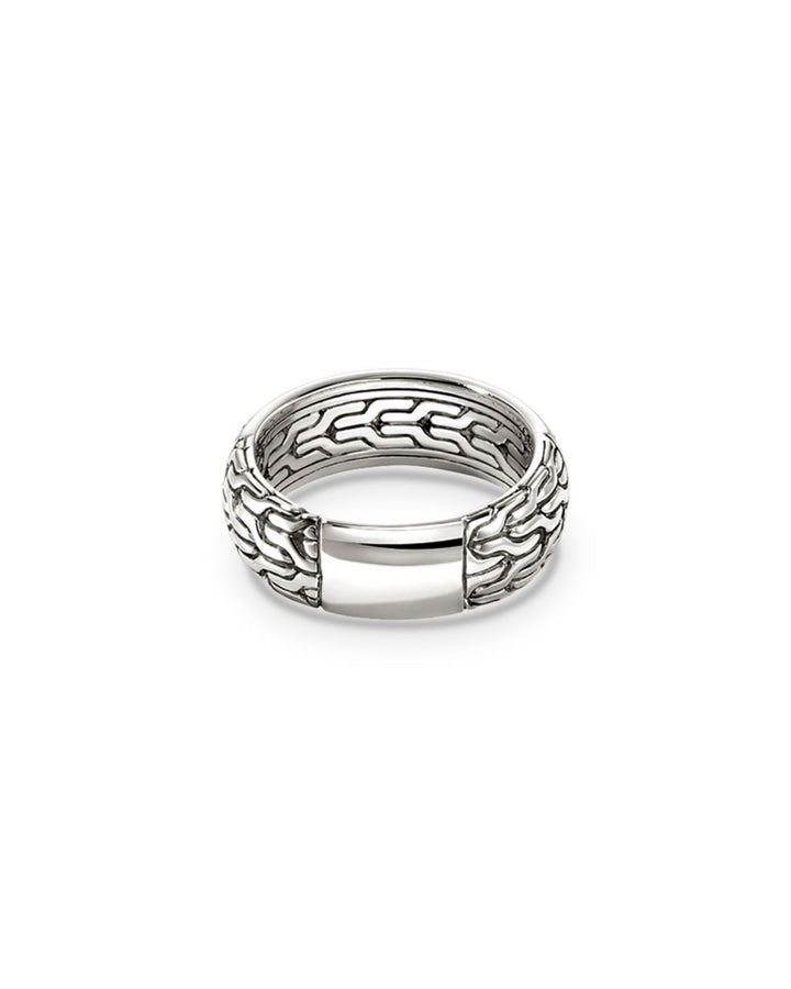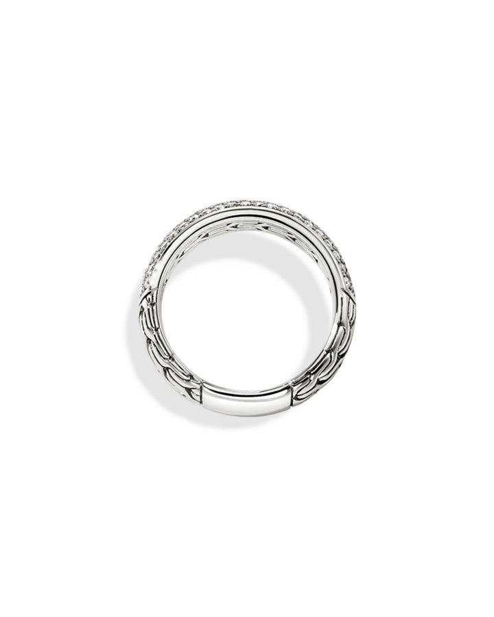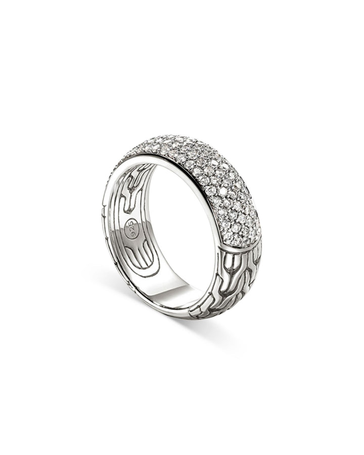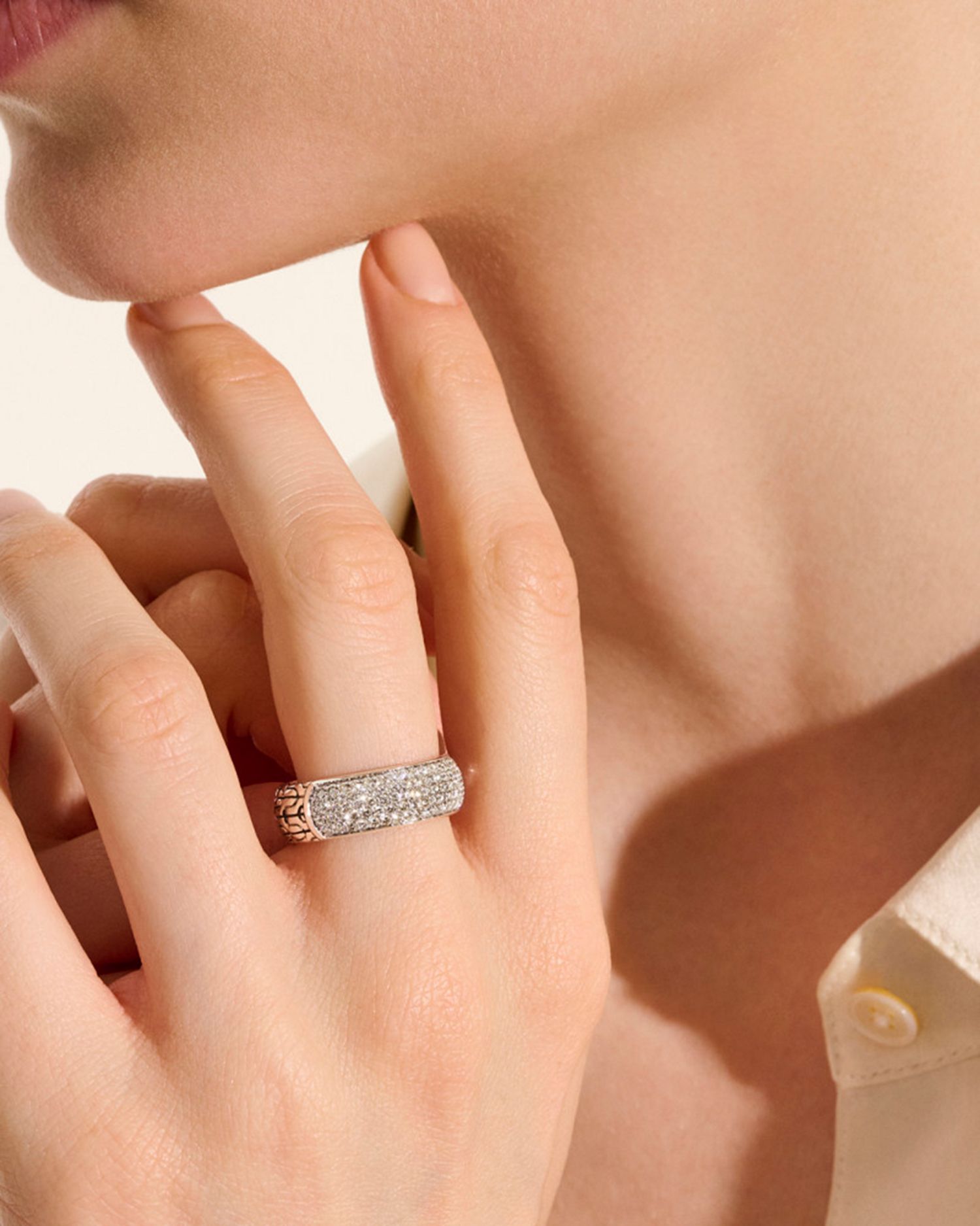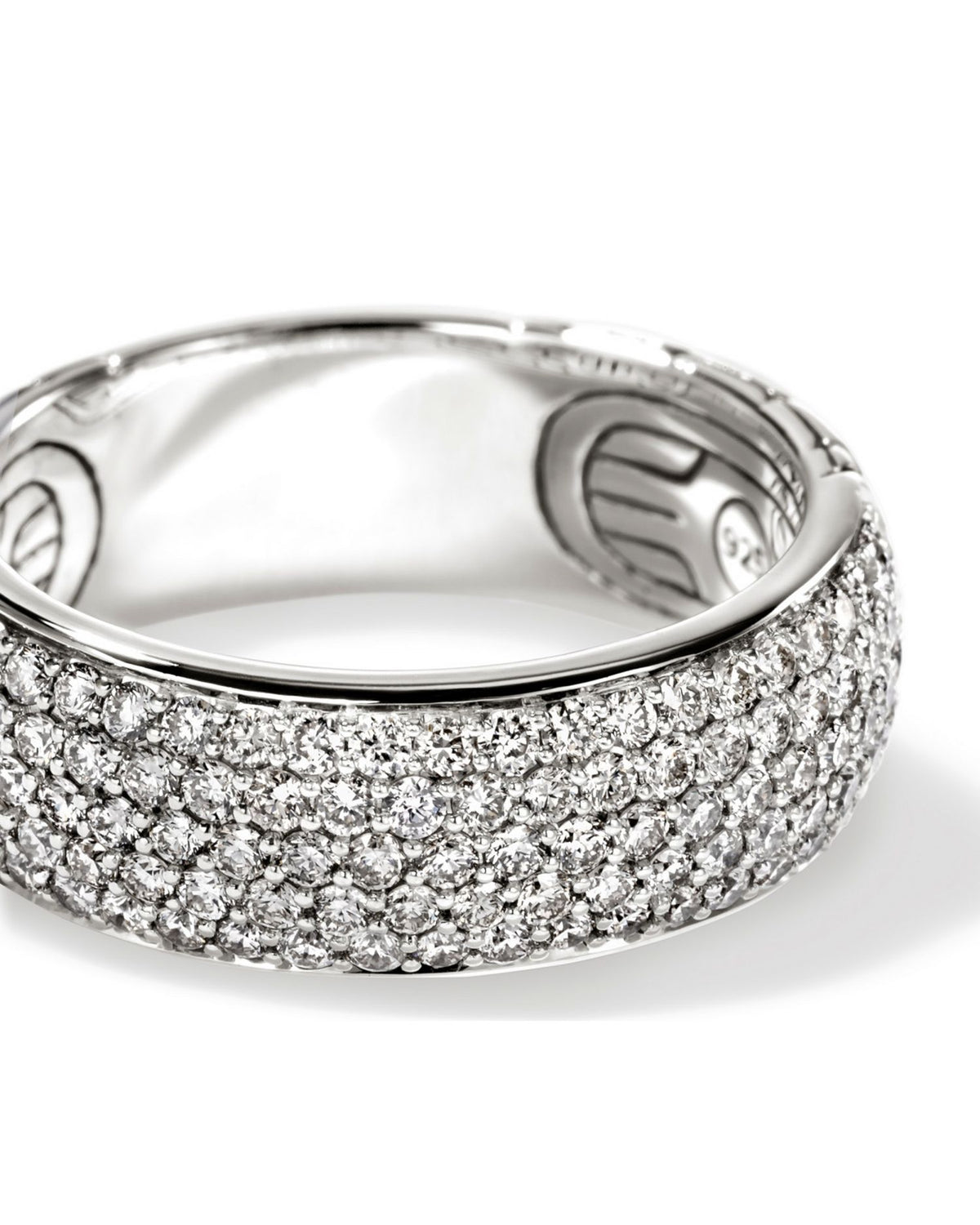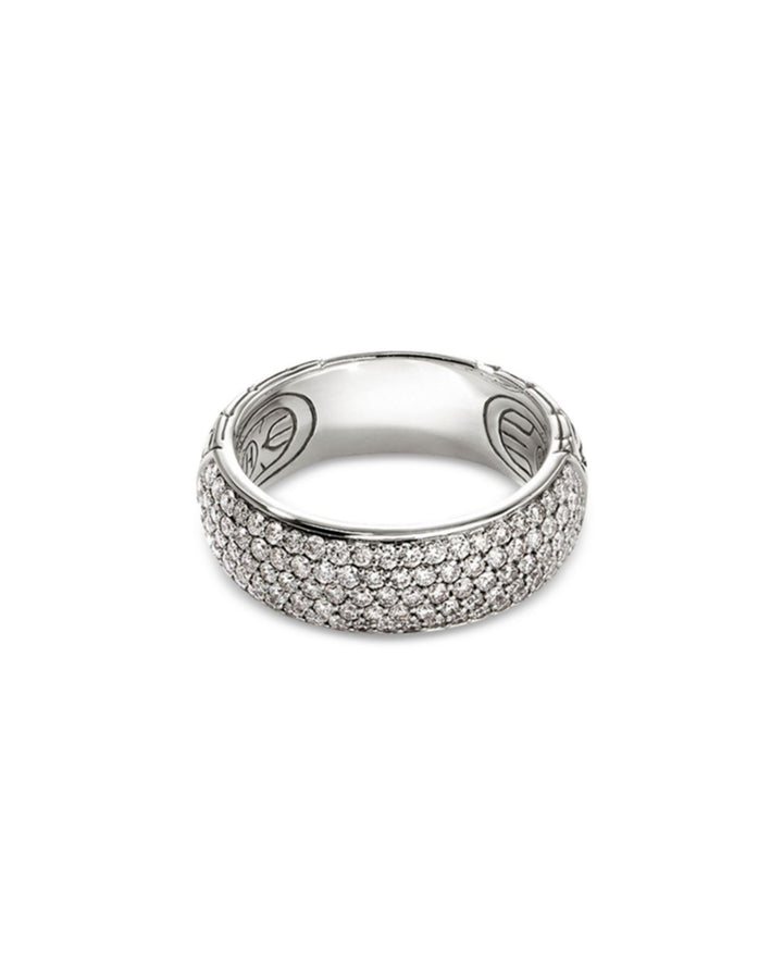 This Sterling Silver JH Essentials Pavé Diamond Band Ring by John Hardy is a strikingly elegant piece. From the JH Essentials collection, its mixed-texture design and pavé diamonds make it a refined accessory for both casual and formal occasions.