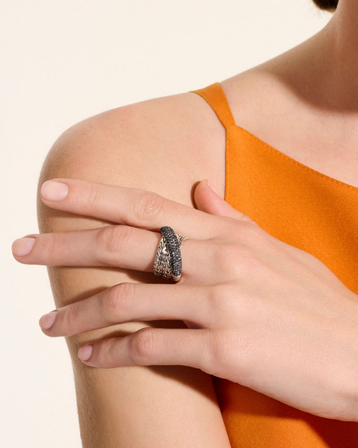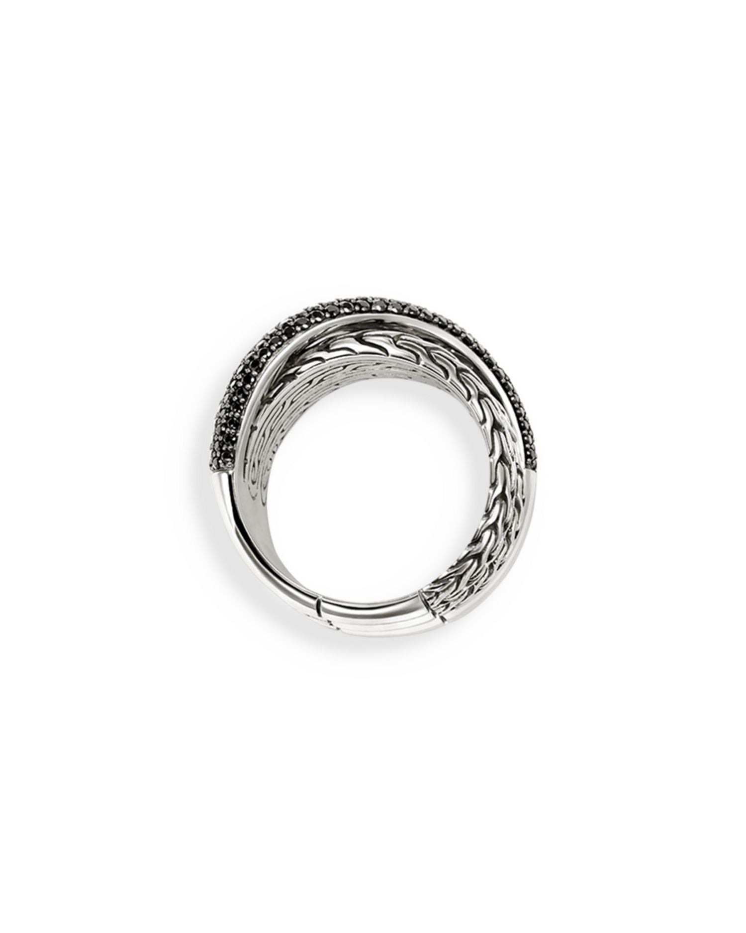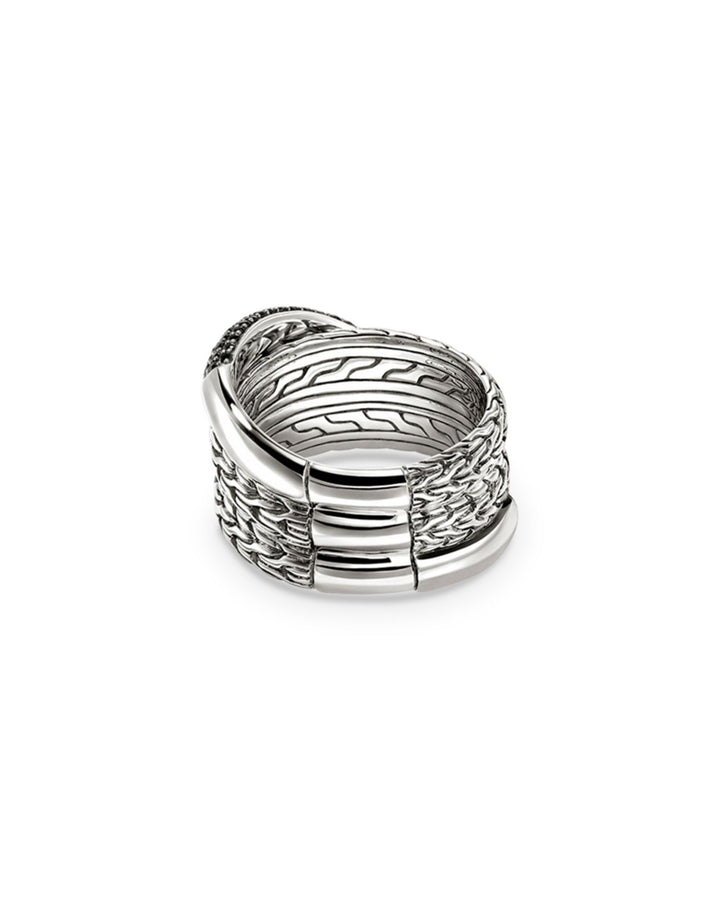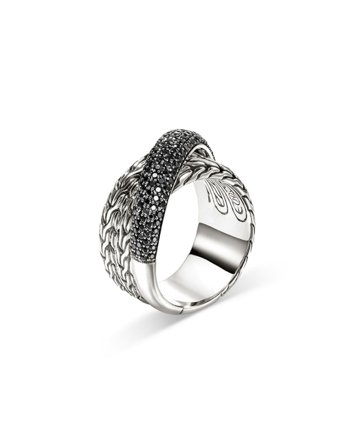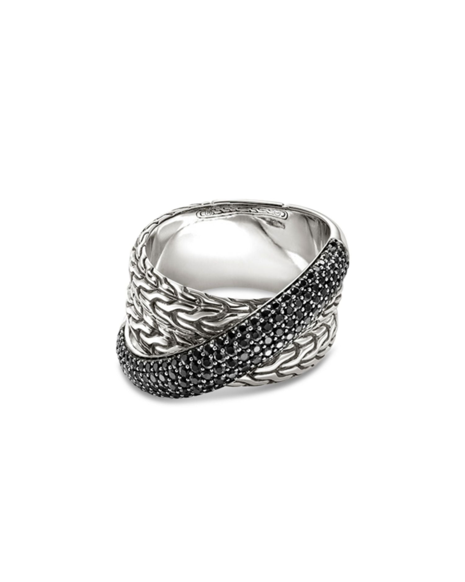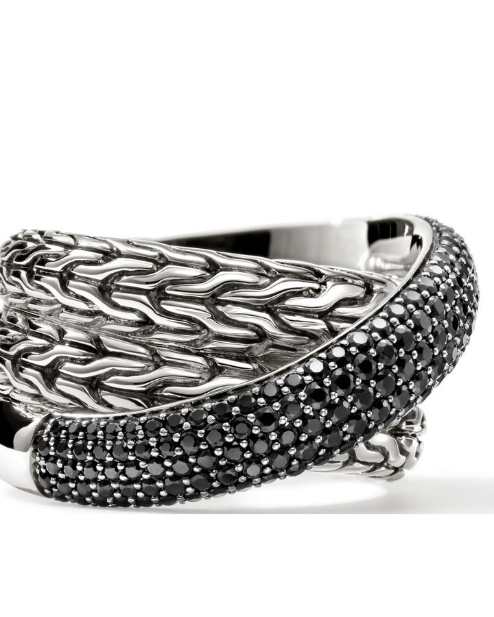 This Sterling Silver JH Essentials Black Sapphire Pavé Crossover Statement Ring by John Hardy combines bold design with meticulous craftsmanship. From the JH Essentials collection, its darkly elegant crossover design and carved chain details make it a sophisticated and versatile addition to any jewelry collection.
