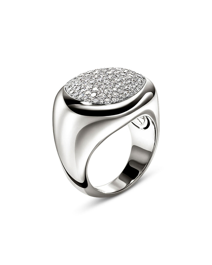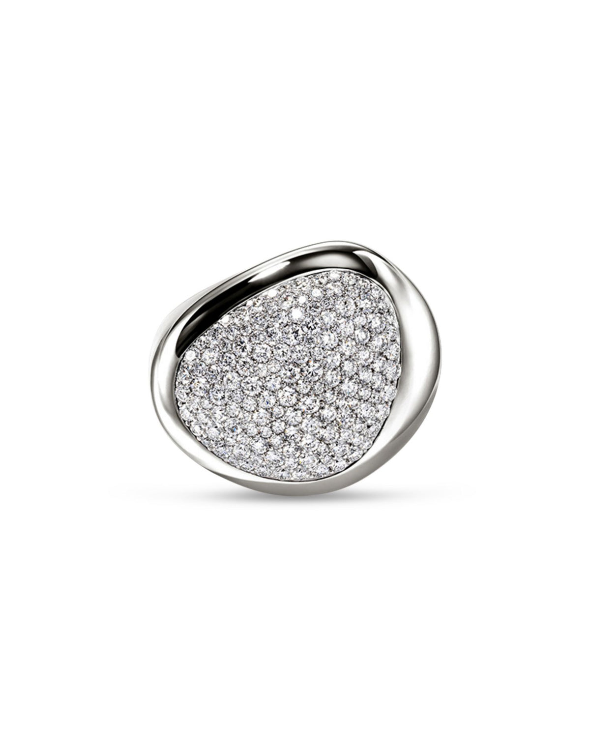This Sterling Silver Pebble Diamond Pavé Statement Ring by John Hardy exudes sophistication and elegance. From the Pebble collection, its shimmering diamond pavé design and bold construction make it a standout statement piece for special occasions.