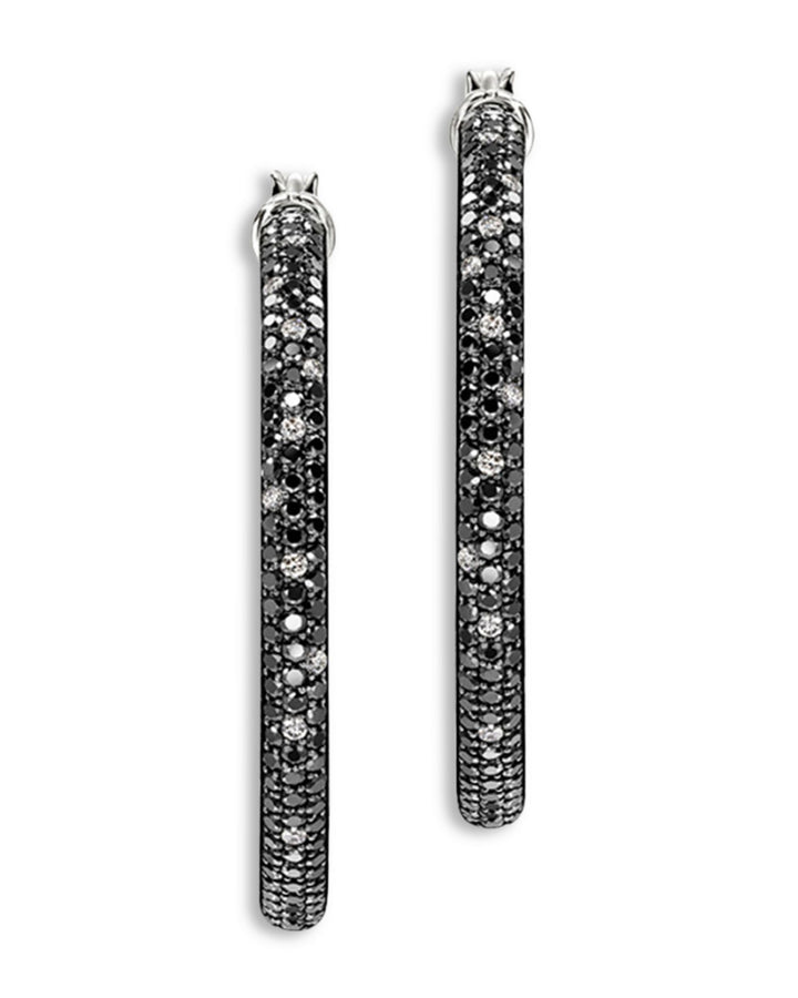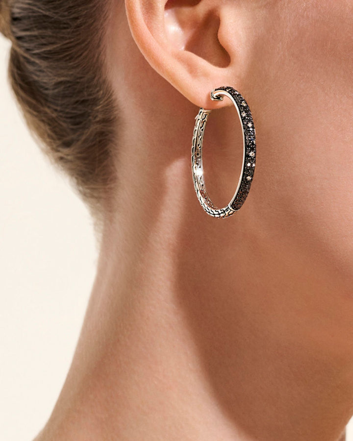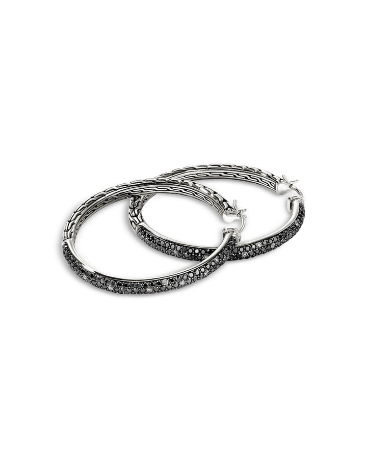 These Sterling Silver JH Essentials Diamond Hoop Earrings by John Hardy feature a dazzling combination of black and white diamond pavé. From the JH Essentials collection, their bold 1.4-inch size and snap lock closure make them a sophisticated choice for any occasion.