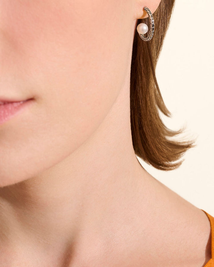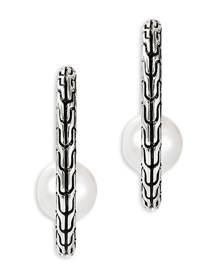 These Sterling Silver JH Essentials Cultured Freshwater Pearl Carved Chain Hoop Earrings by John Hardy elevate classic hoop earrings with cultured freshwater pearl accents. From the JH Essentials collection, their carved chain design and medium size make them a refined and versatile accessory for any occasion.