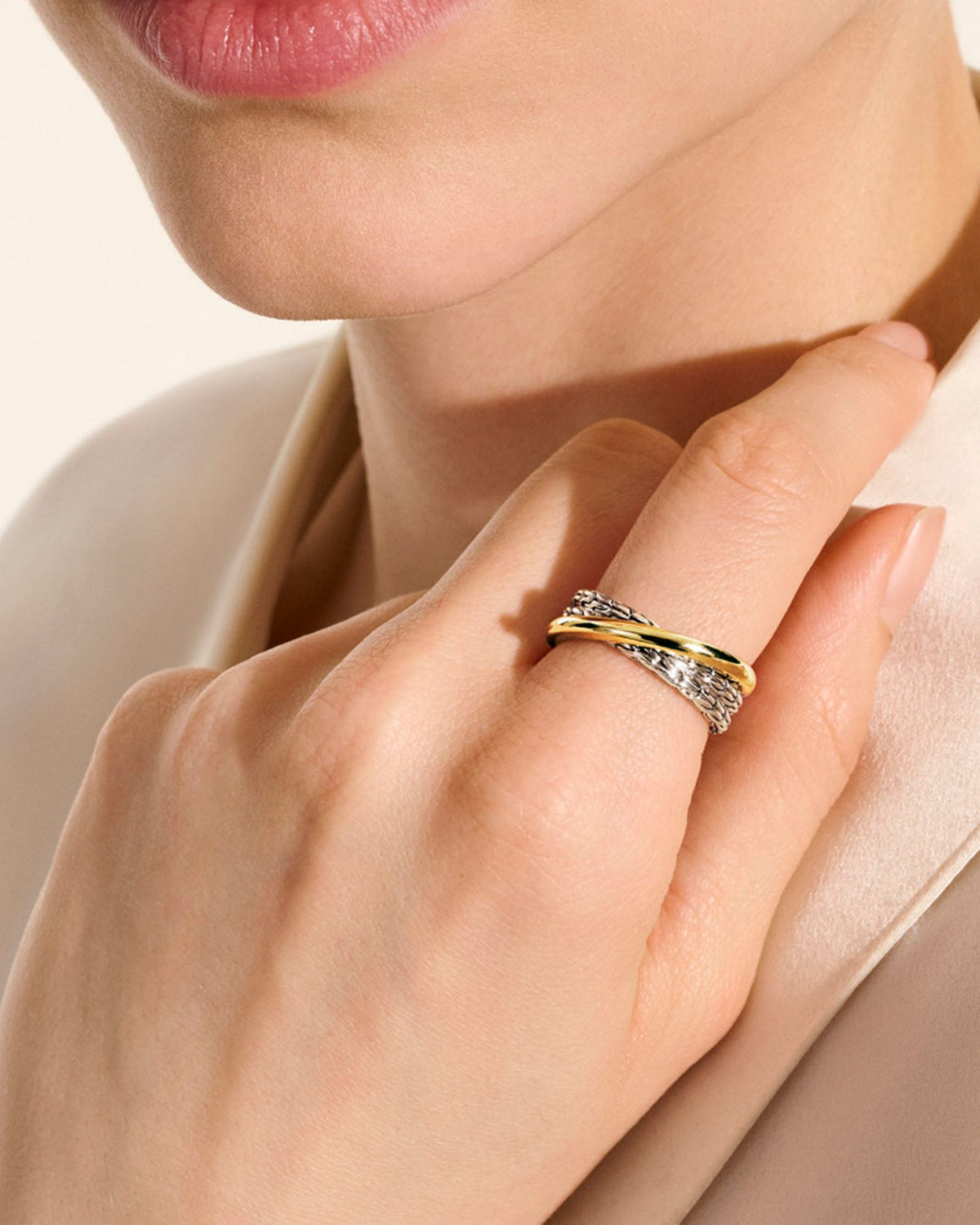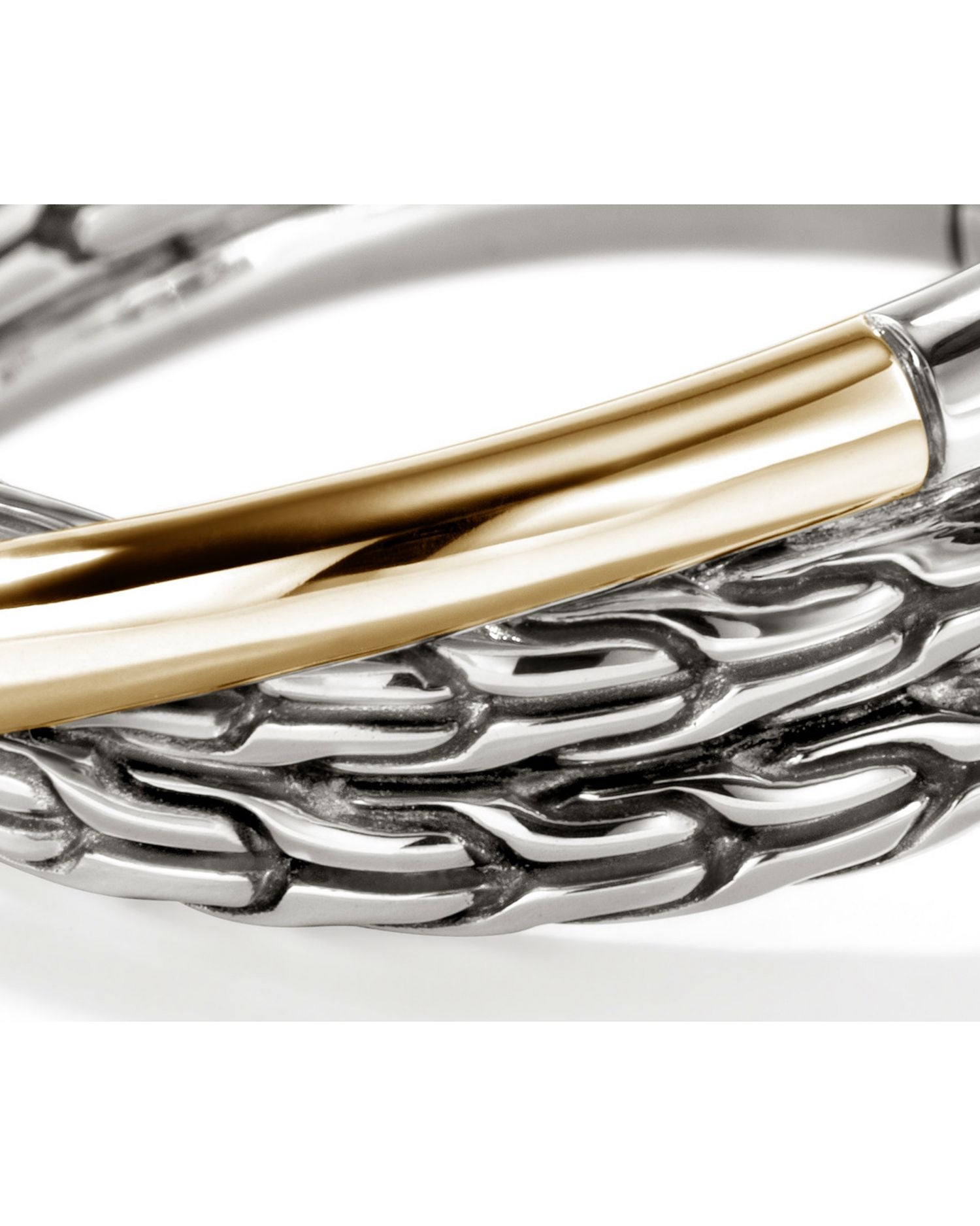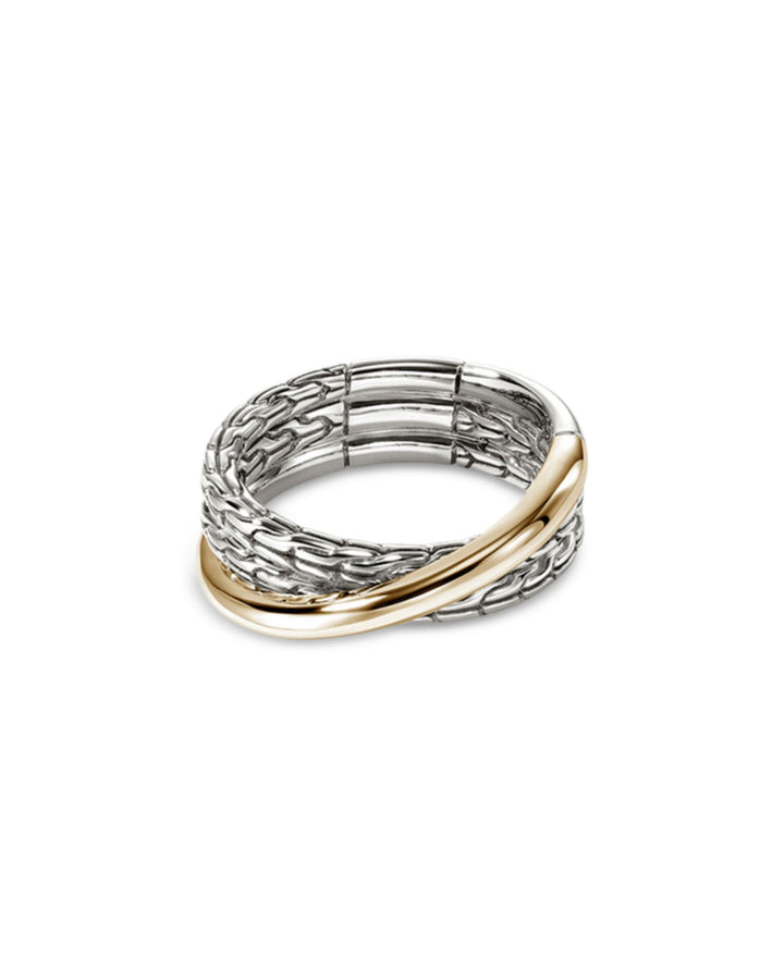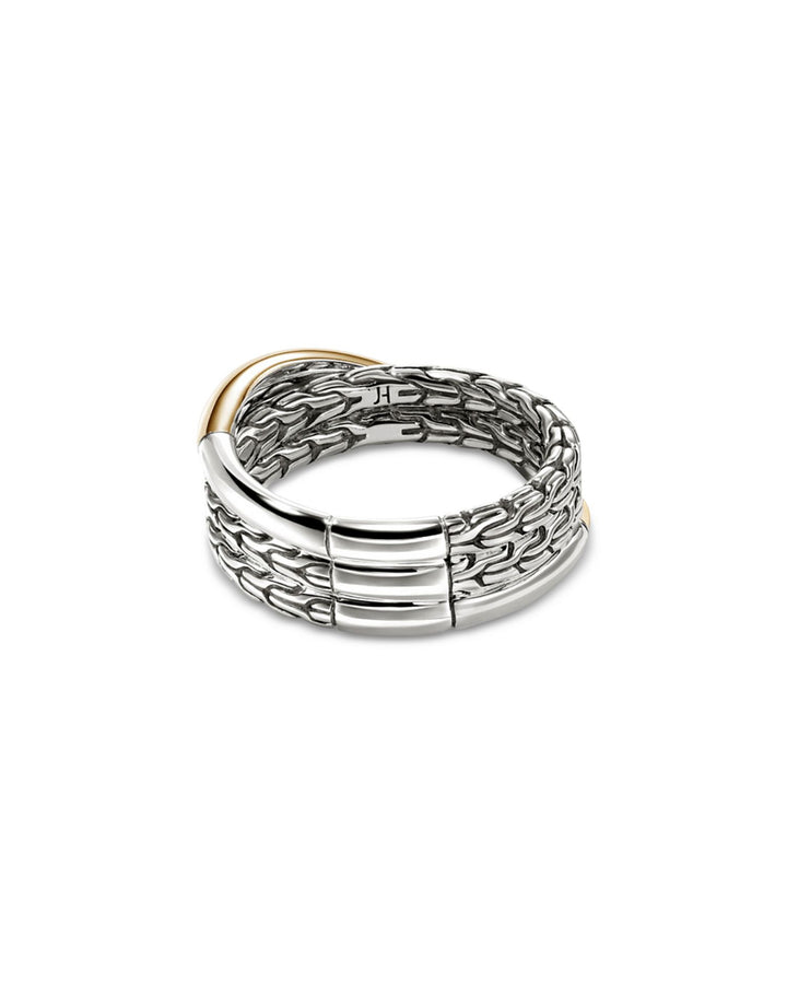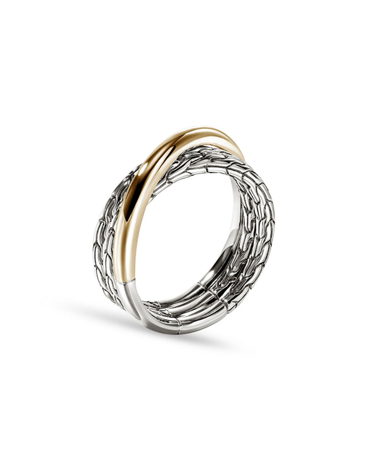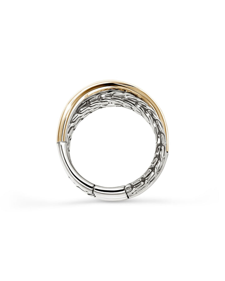 This 14K Yellow Gold & Sterling Silver JH Essentials Crossover Ring by John Hardy is a striking blend of textures. From the JH Essentials collection, its polished gold and textured silver crossover design creates a bold yet refined statement piece.