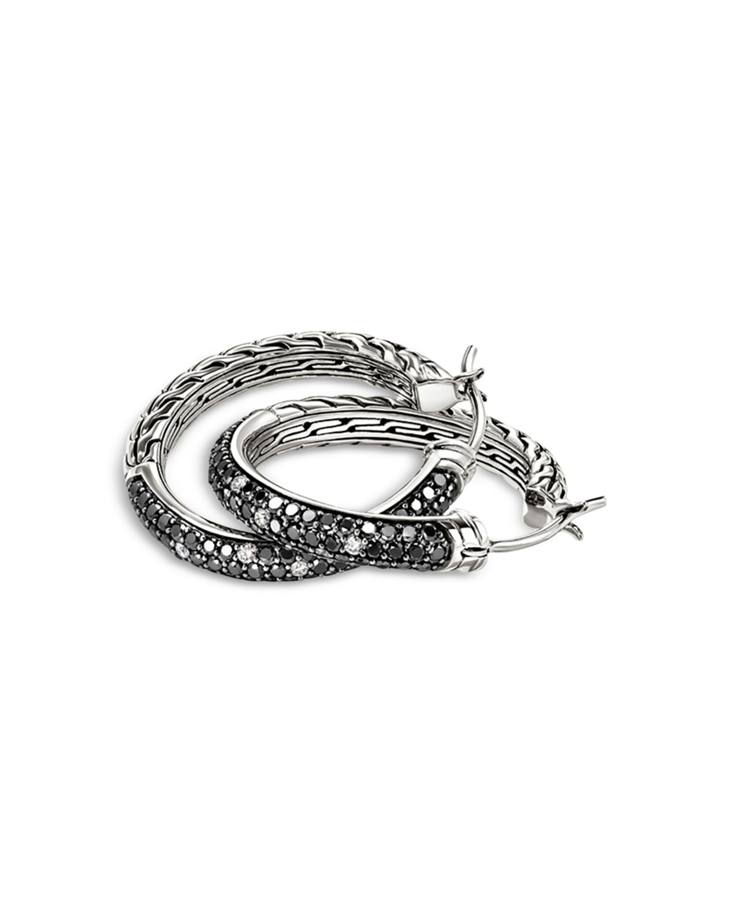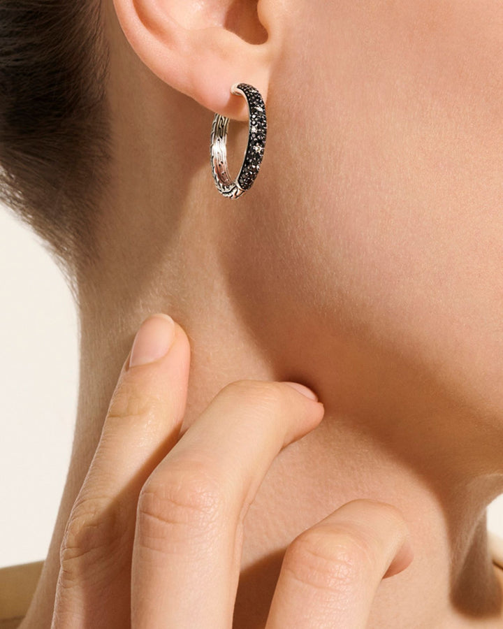 These Sterling Silver JH Essentials Diamond Pavé Black Sand Hoop Earrings by John Hardy exude modern sophistication. From the JH Essentials collection, their black and white diamond pavé design adds a dramatic edge, reminiscent of exotic black sand beaches.