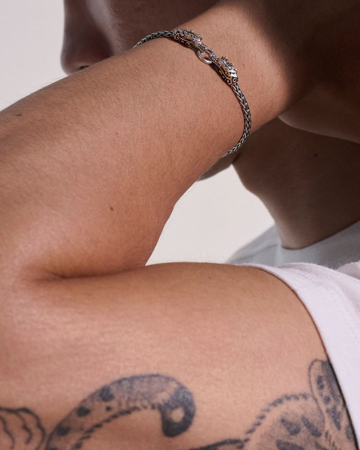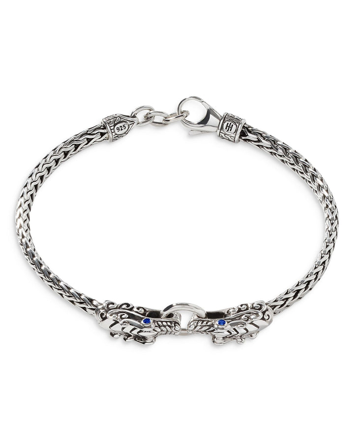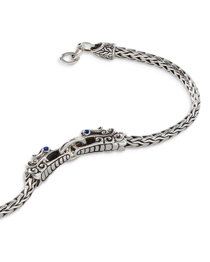 This Sterling Silver Legends Naga Blue Sapphire Dragon Link Bracelet by John Hardy features a slimline link design adorned with a dramatic dragon head motif. From the Legends Naga Collection, it combines elegance with mythical symbolism.