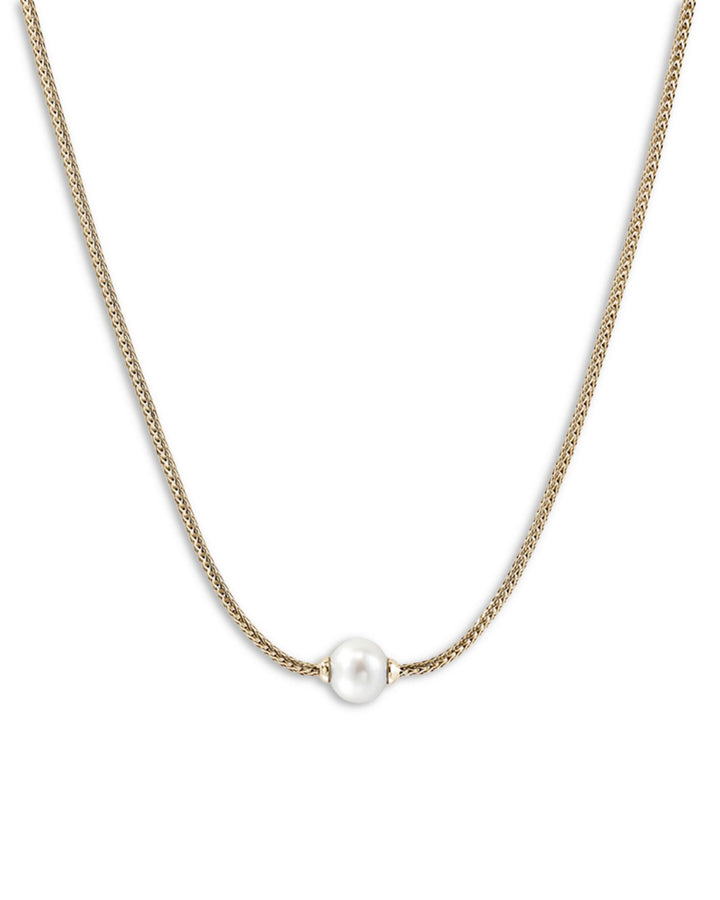 This 14K Yellow Gold JH Essentials Cultured Freshwater Pearl Pendant Necklace by John Hardy showcases timeless elegance with a solitaire pearl suspended on a woven gold chain.