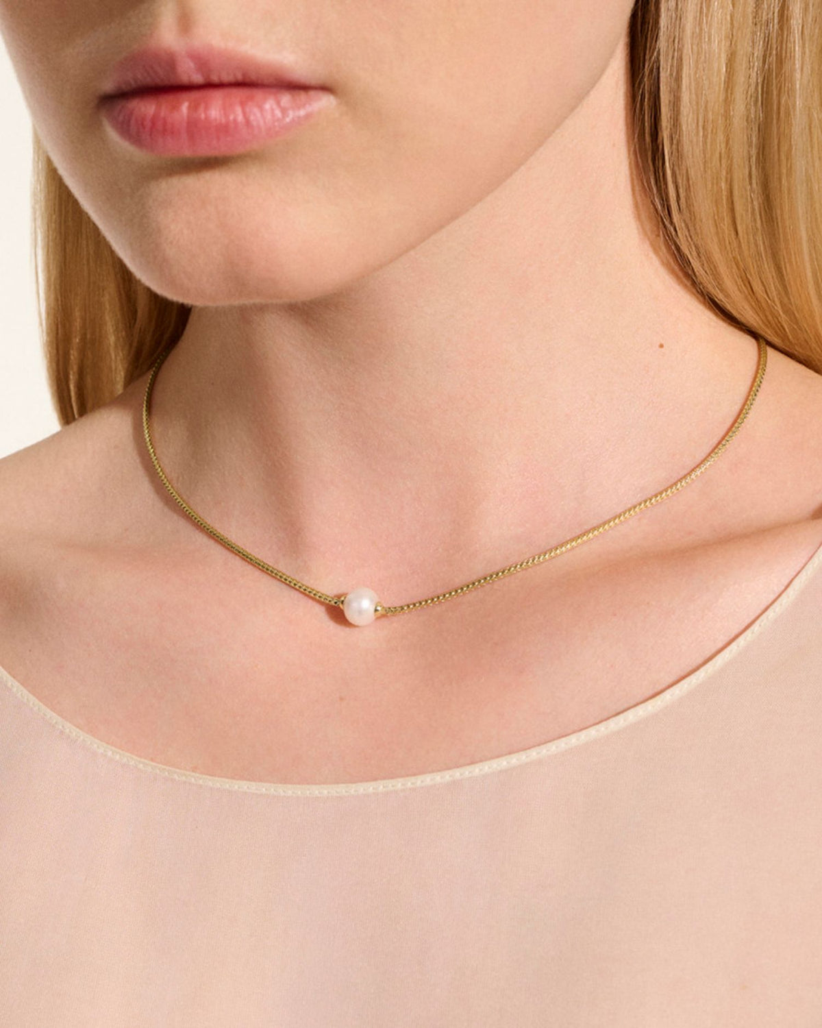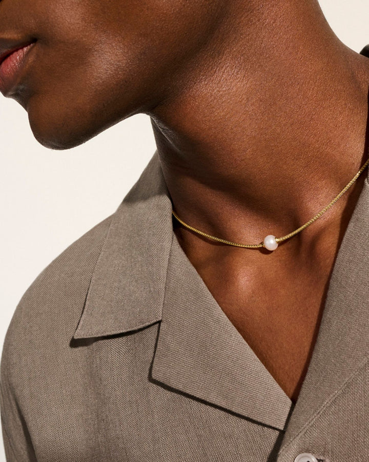 Handcrafted in 14K yellow gold with an 8-8.5mm cultured freshwater pearl. Adjustable 16-18'L with a lobster clasp closure.