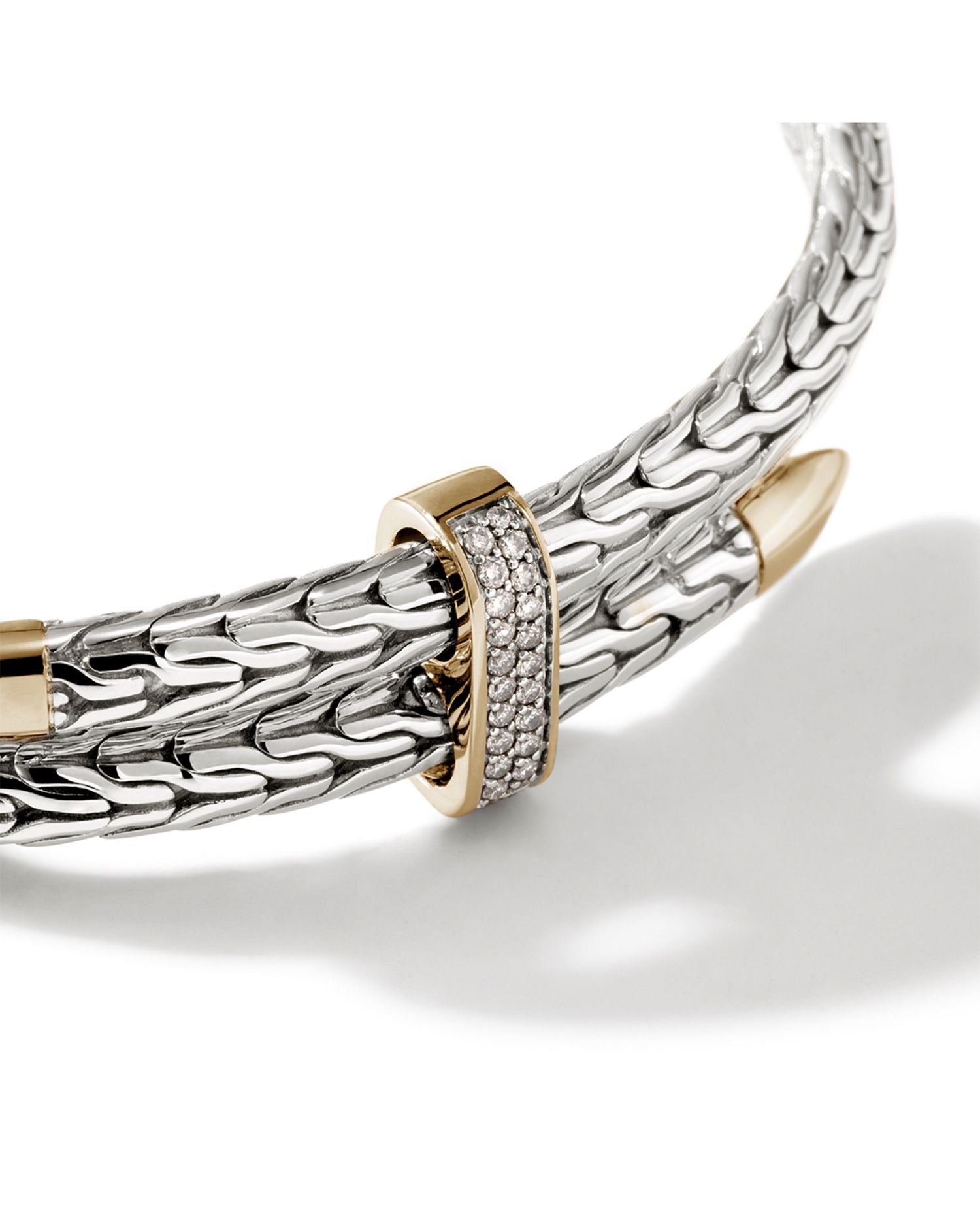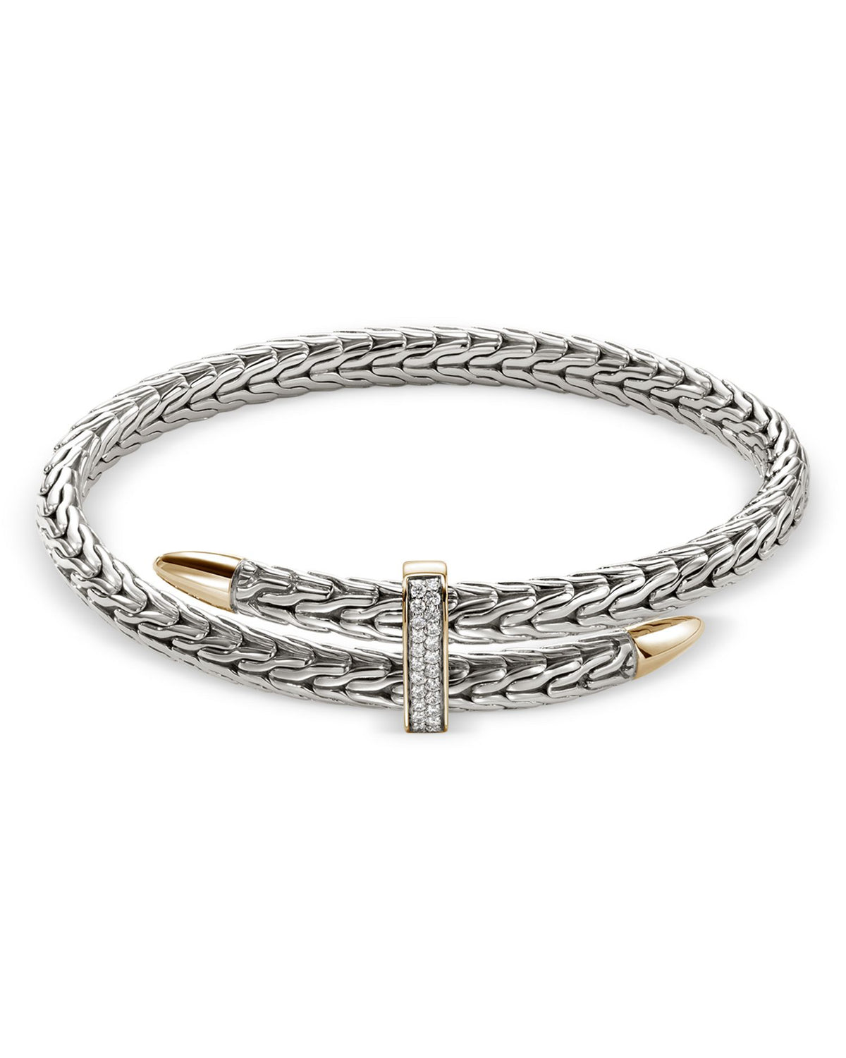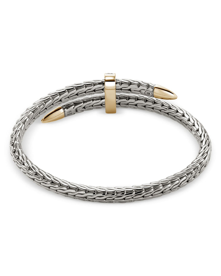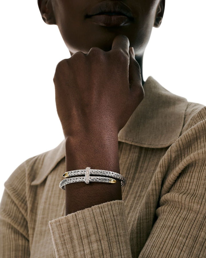 This 14K Yellow Gold & Sterling Silver Classic Chain Diamond Pavé Bypass Cuff Bracelet by John Hardy boasts a two-tone design with stunning diamond pavé accents.