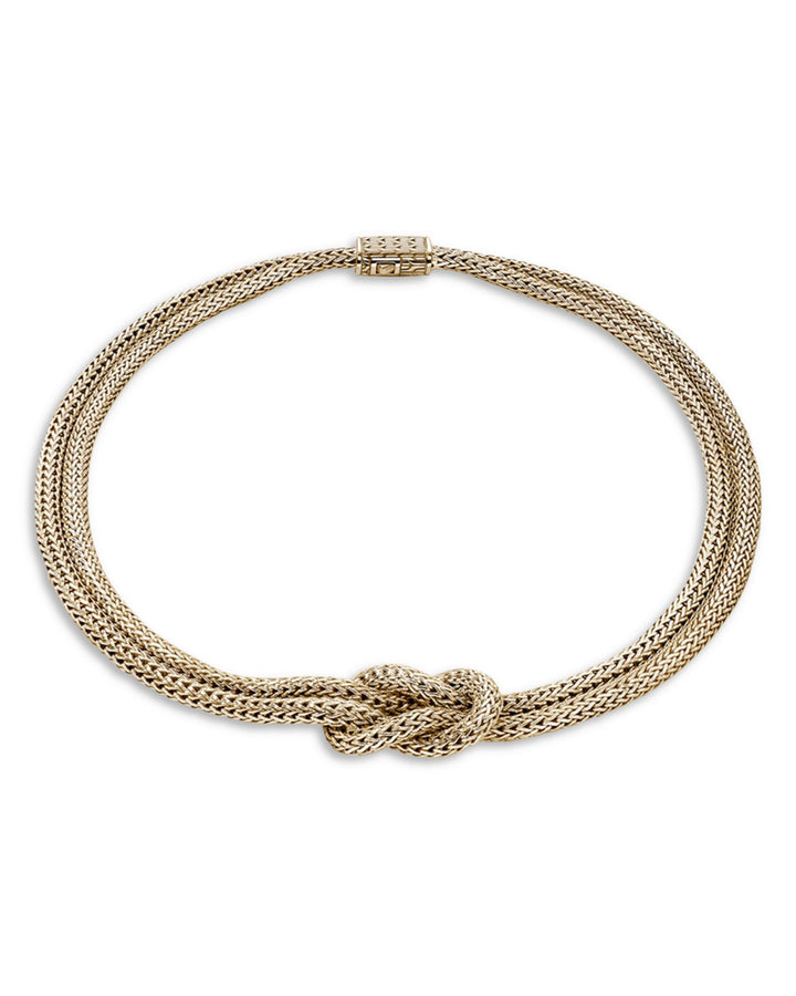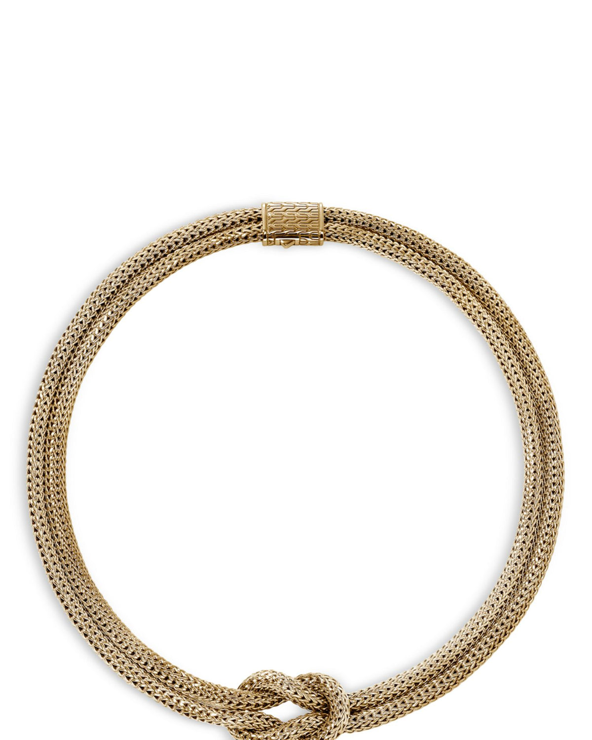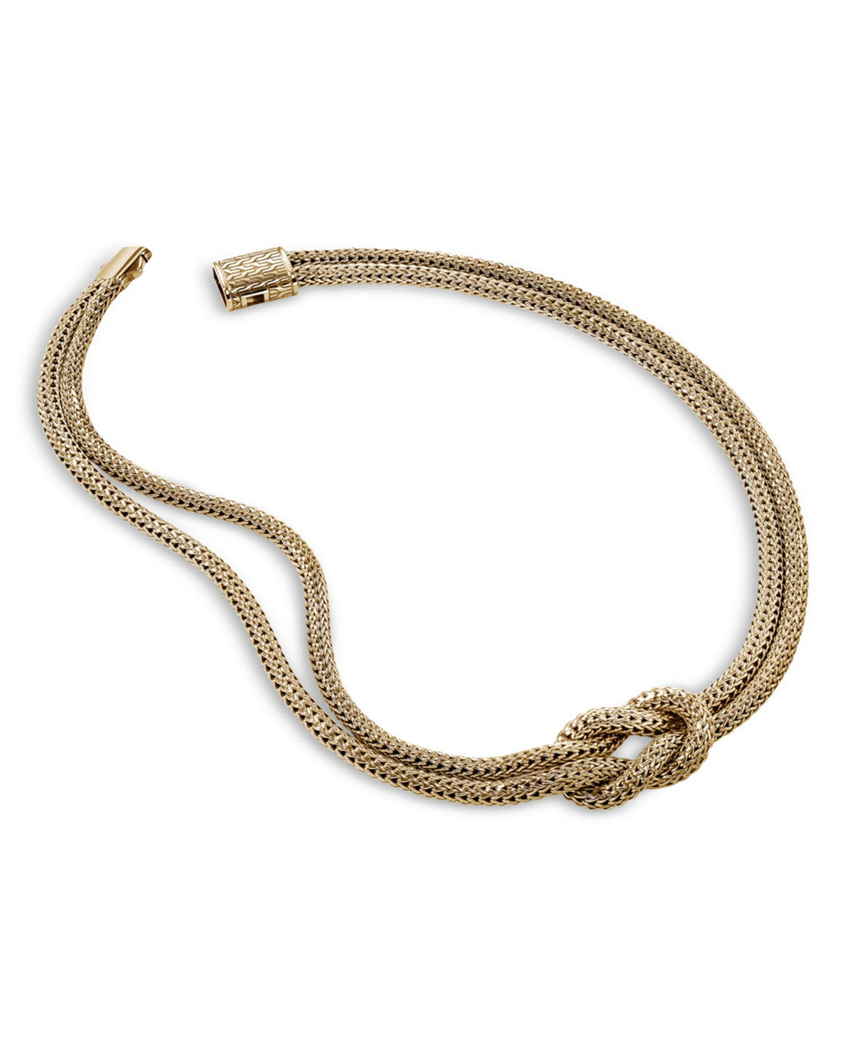 This 14K Yellow Gold Love Knot Double Chain Collar Necklace by John Hardy features a woven chain collar design with a luxurious love knot centerpiece.