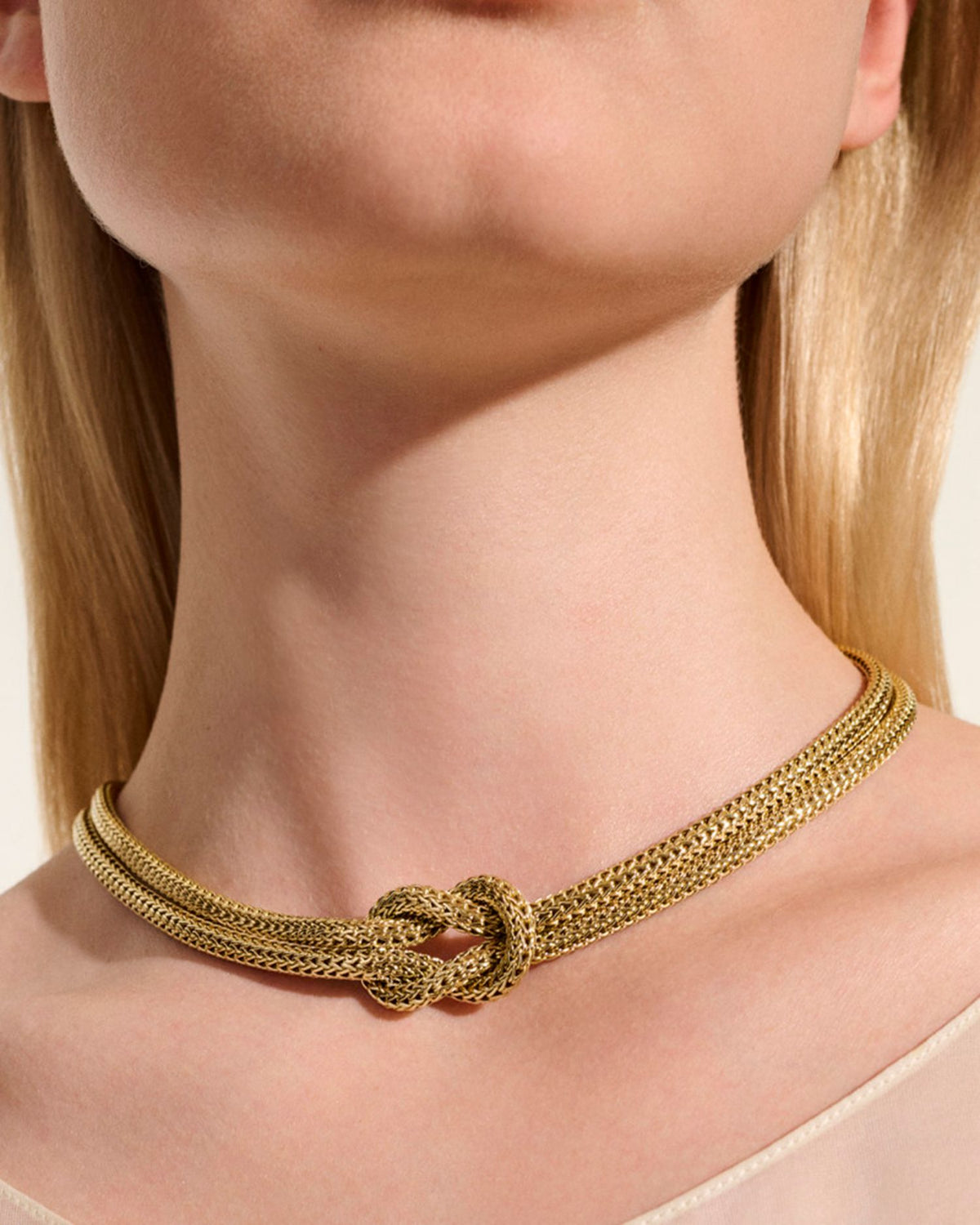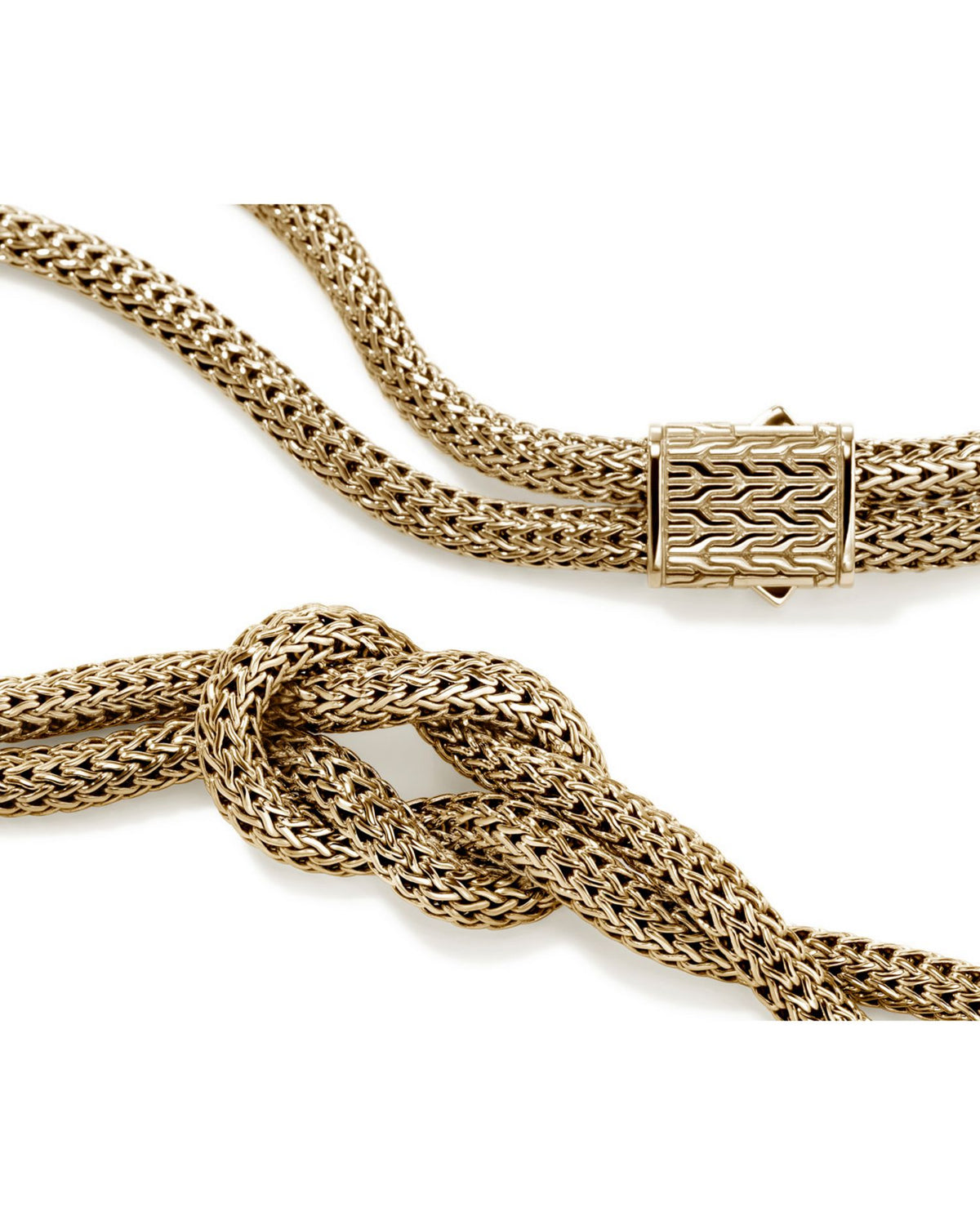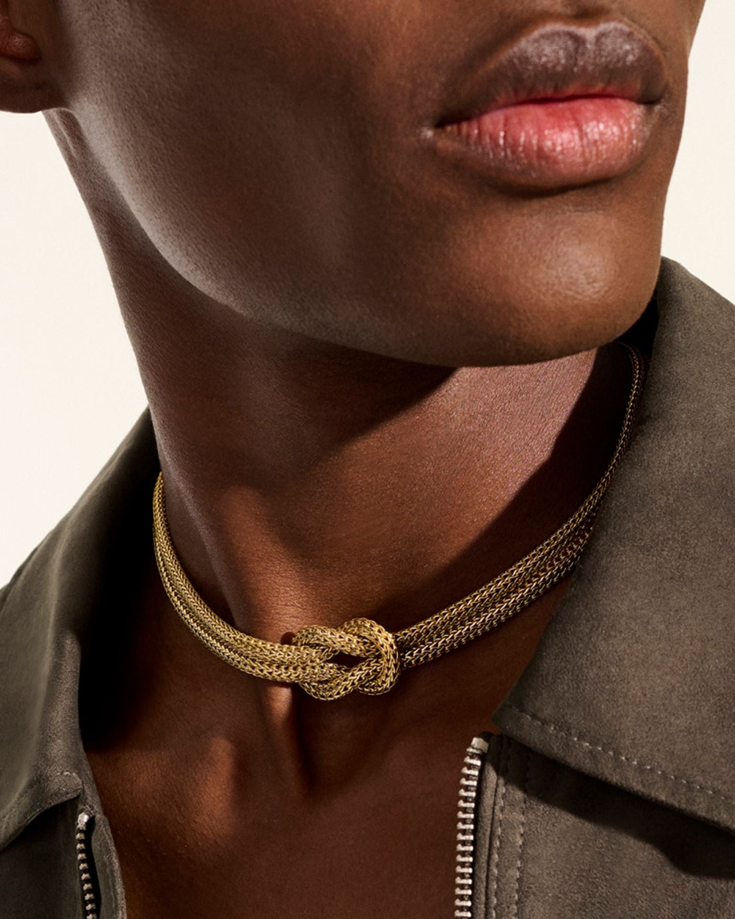 This 14K Yellow Gold Love Knot Double Chain Collar Necklace by John Hardy features a woven chain collar design with a luxurious love knot centerpiece.