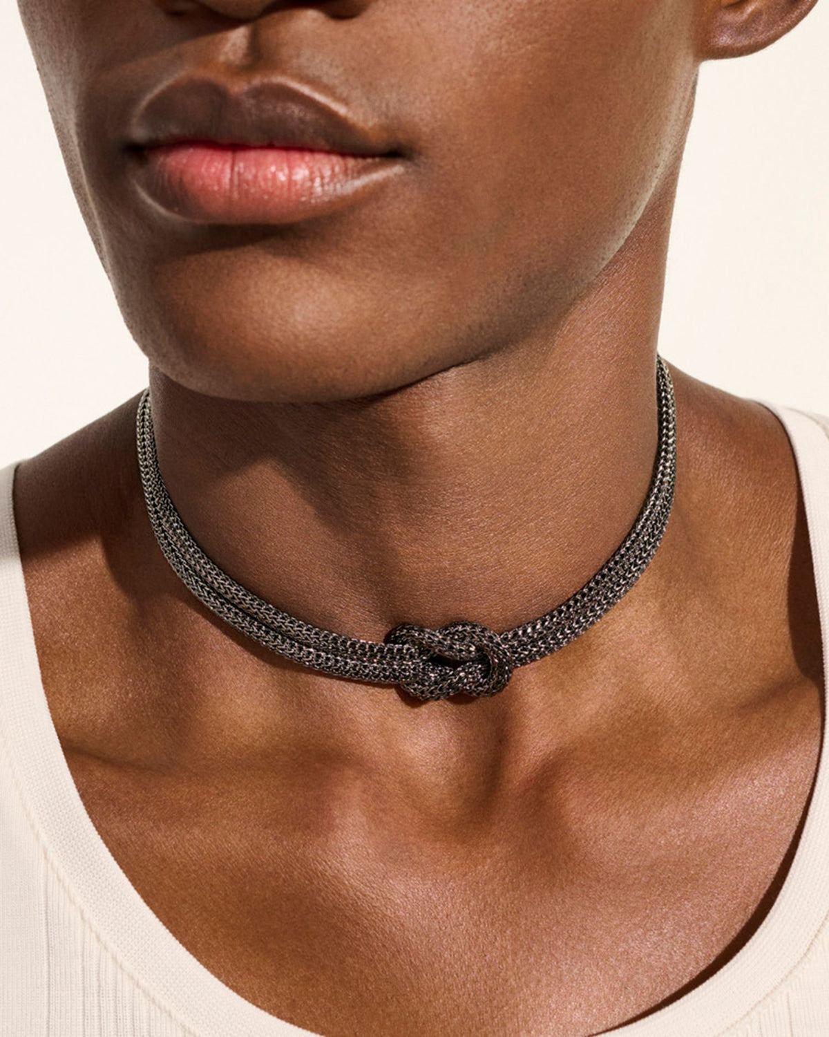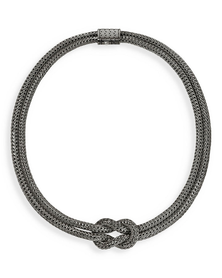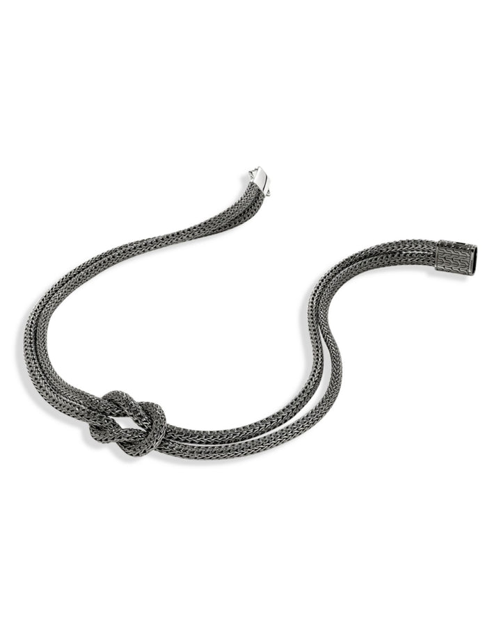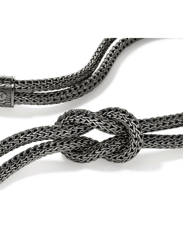 This Black Rhodium-Plated Sterling Silver Love Knot Double Woven Chain Statement Necklace by John Hardy combines bold glamour with intricate design. From the Love Knot collection, this piece brings a dark sophistication with its dramatic black rhodium plating and detailed woven chain. Perfect for elevating any look.