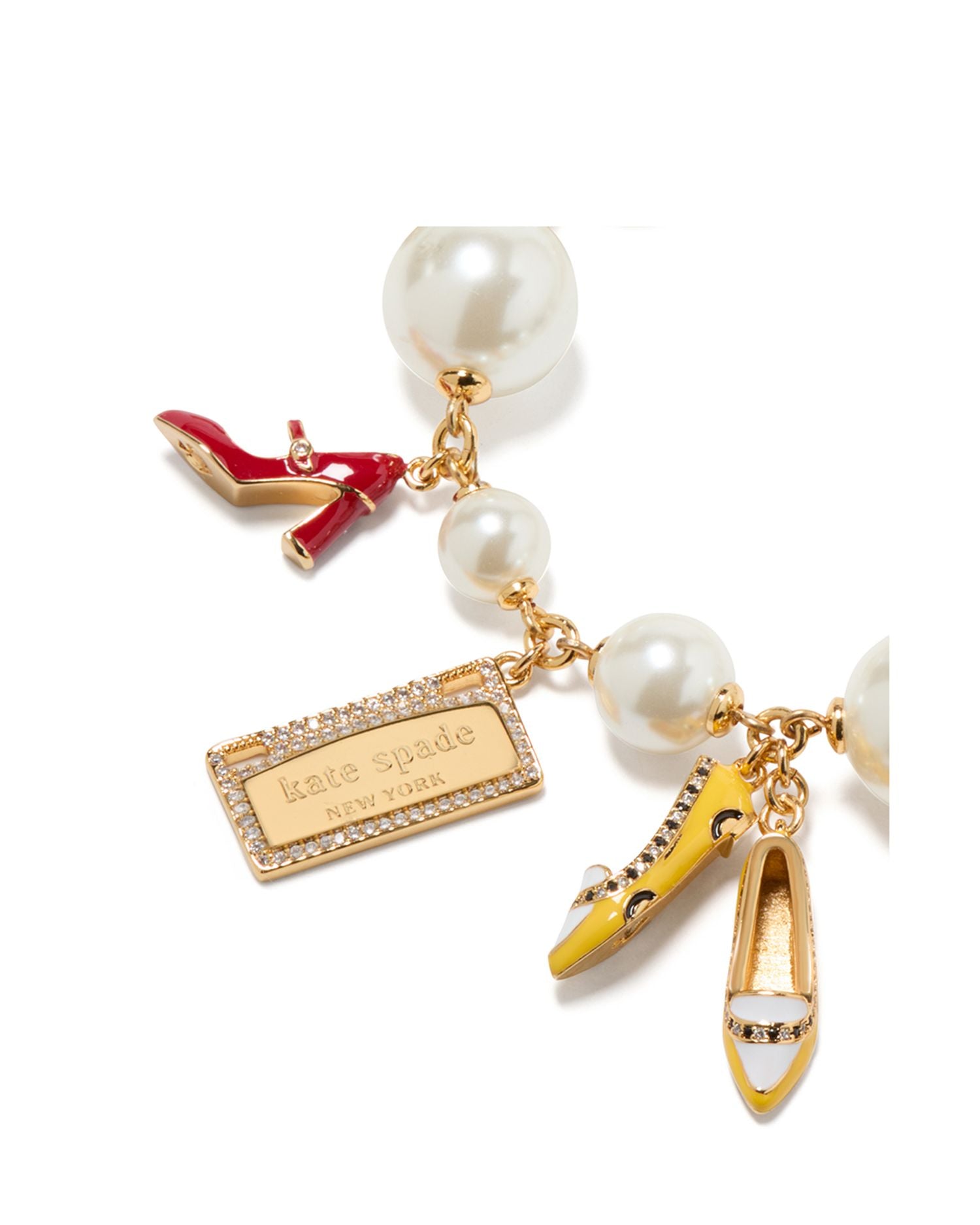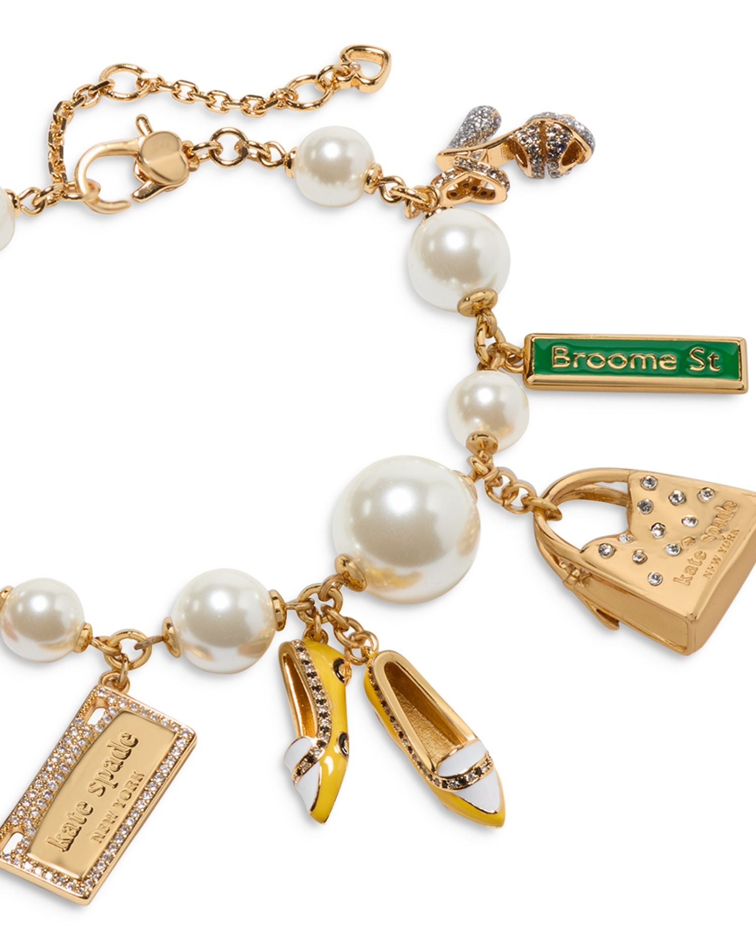 Made in gold-tone metal with cubic zirconia and glass accents. Length: 7.25' with a 1.5' extension. Features a signature spade lobster clasp closure.