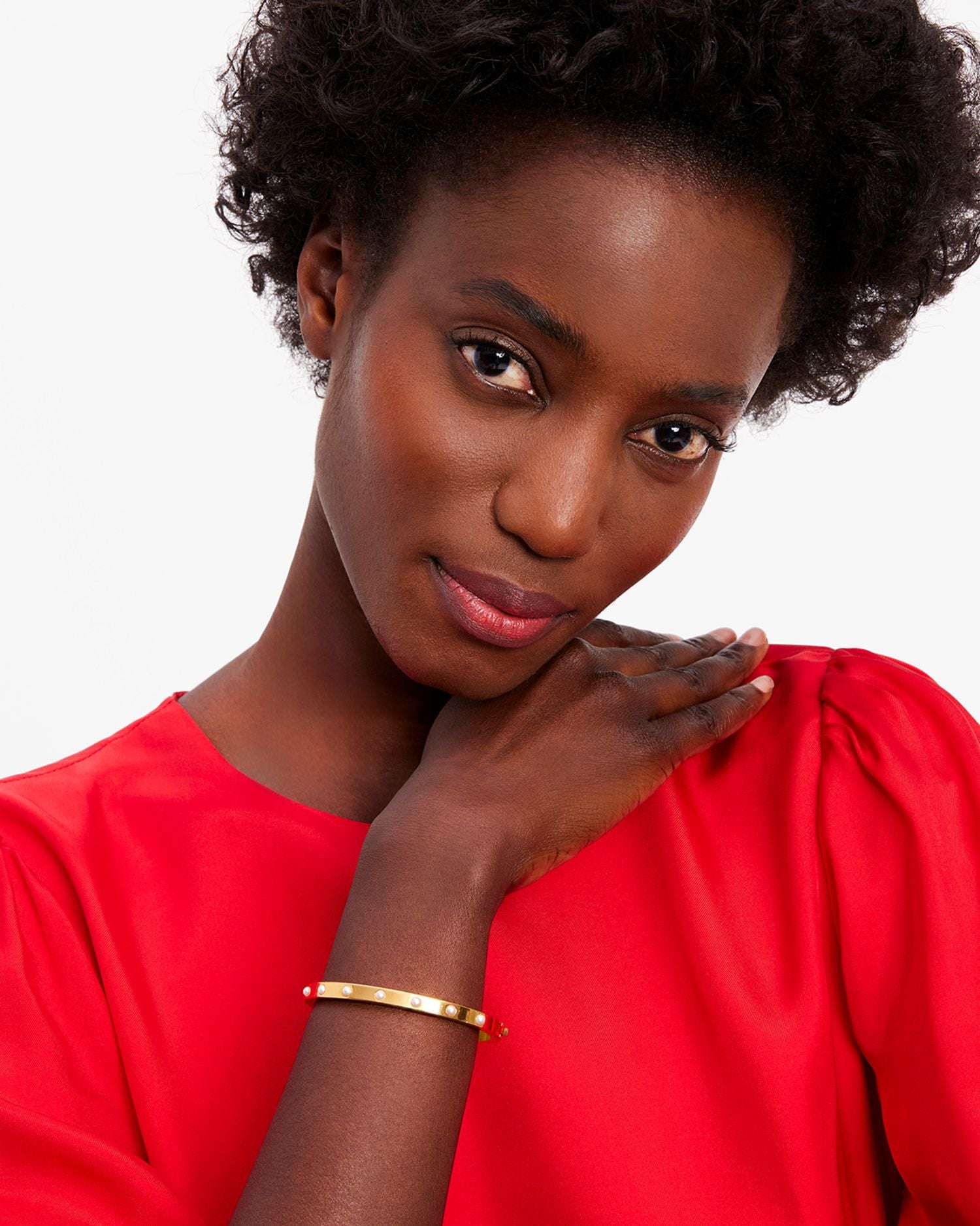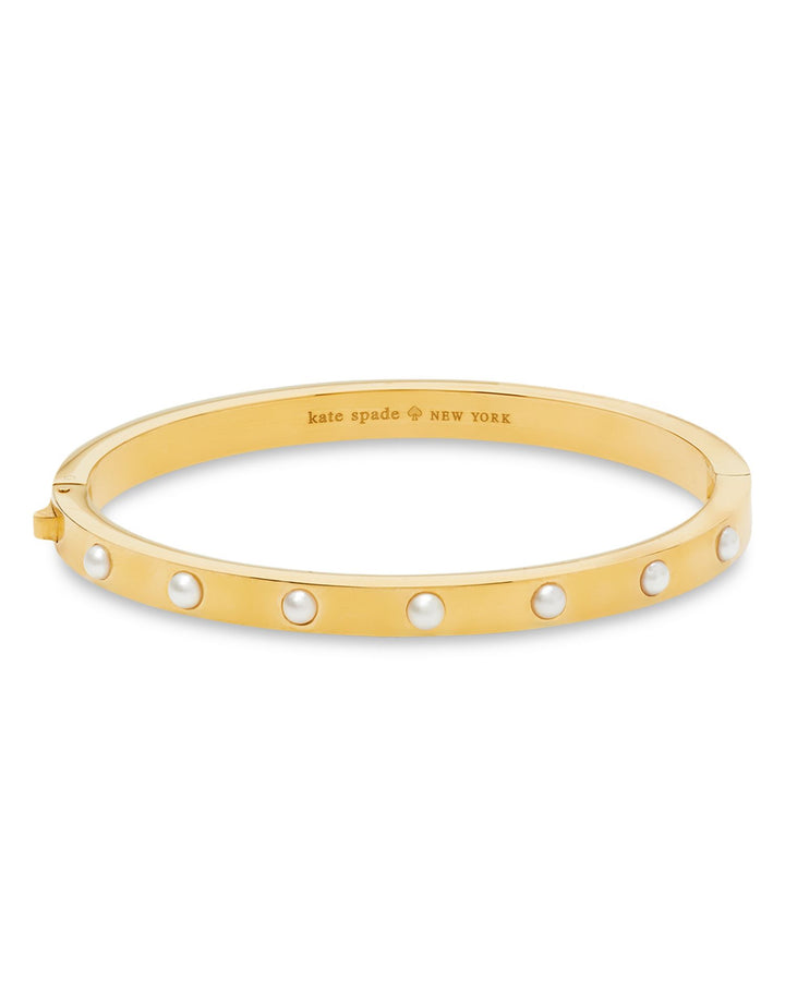 This Set in Stone Imitation Pearl Hinged Bangle Bracelet by Kate Spade New York combines timeless elegance with modern simplicity. Featuring a lustrous imitation pearl and a sleek gold-tone finish, this hinged bangle is perfect for adding a touch of sophistication to any look.
