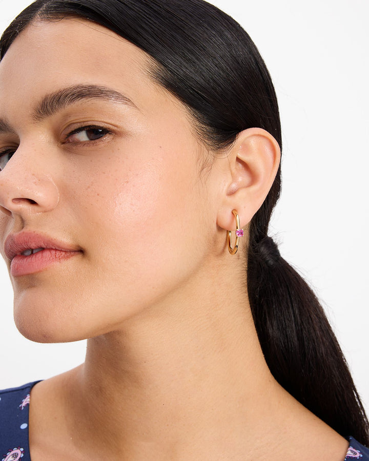 These Little Luxuries Pink Cubic Zirconia Solitaire Small Hoop Earrings by Kate Spade New York from the Little Luxuries collection are a charming and versatile accessory. The solitaire pink cubic zirconia adds a touch of color and sophistication to these classic hoops.