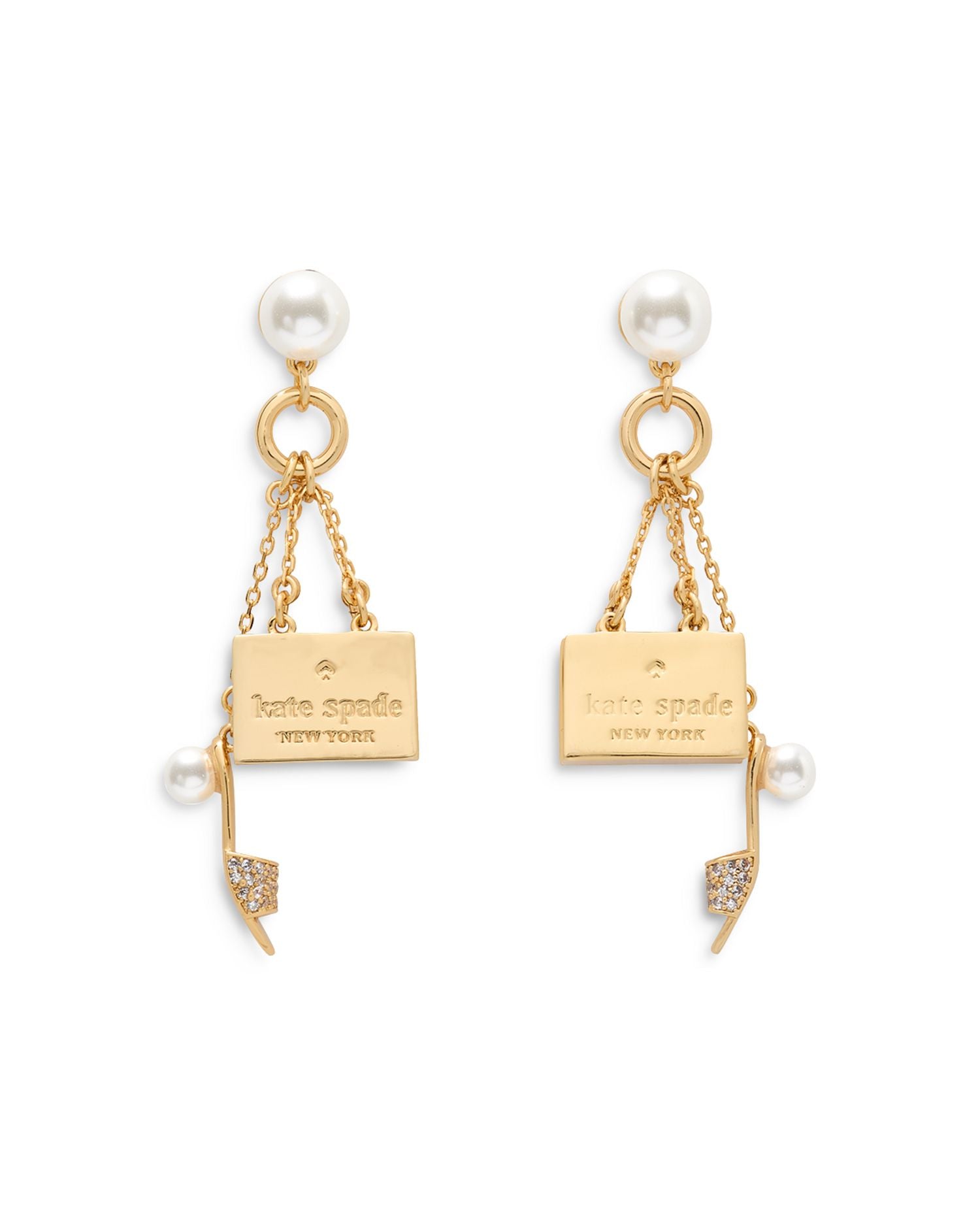 Crafted in gold-tone metal with cubic zirconia and glass accents. Length: 2.2'. Features a post back closure with the signature spade clutch.
