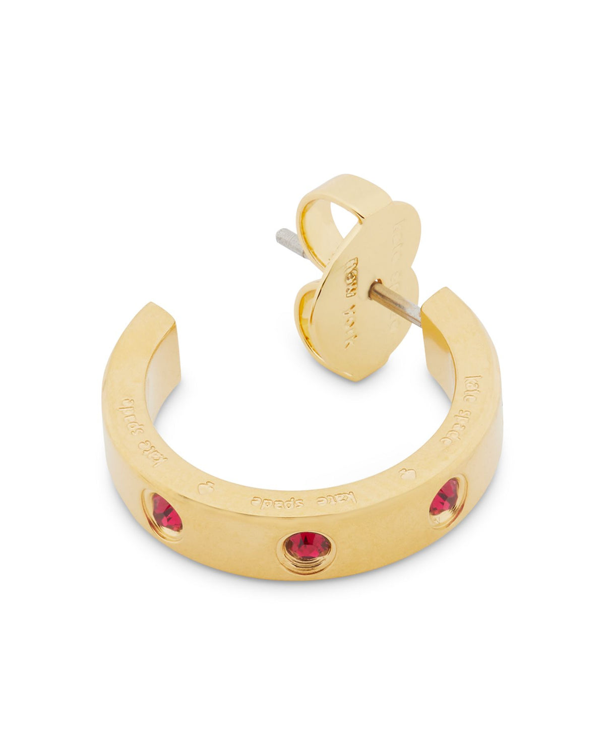 These Red Pavé Huggie Hoop Earrings by Kate Spade New York are a bold and elegant addition to your accessory collection. The vibrant red cubic zirconia adds a statement-making sparkle, making these hoops perfect for adding a pop of color to your look.